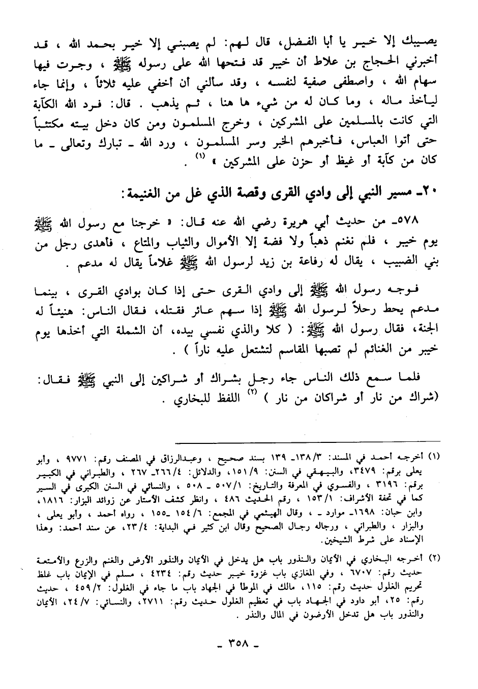 (¬2) أخرجه البخاري في الأيمان والنذور باب هل يدخل في الأيمان والنذور الأرض والغنم والزرع والأمتعة حديث رقم: 6707، وفي المغازي باب غزوة خيبر حديث رقم: 4234، مسلم في الإيمان باب غلظ تحريم الغلول حديث رقم: 115، مالك في الموطأ في الجهاد باب ما جاء في الغلول: 2/ 459، حديث رقم: 25، أبو داود في الجهاد باب في تعظيم الغلول حديث رقم: 2711، والنسائي: 7/ 24، الأيمان والنذور باب هل تدخل الأرضون في المال والنذر.