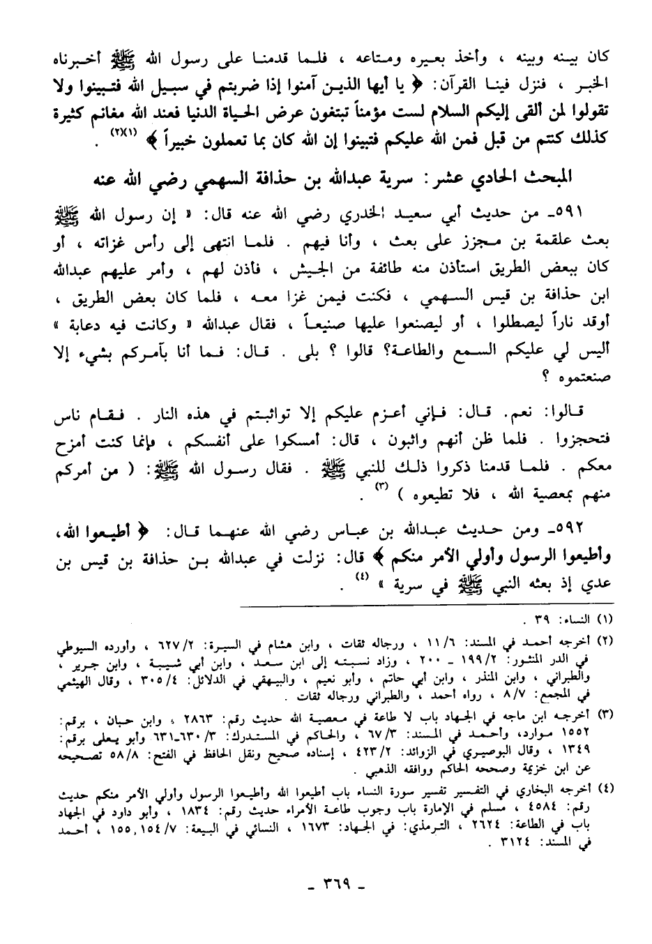 591 - من حديث أبي سعيد الخدري رضي الله عنه قال: "إن رسول الله - صلى الله عليه وسلم - بعث علقمة بن مجزز على بعث، وأنا فيهم. فلما انتهى إلى رأس غزاته، أو كان ببعض الطريق استأذن منه طائفة من الجيش، فأذن لهم، وأمر عليهم عبد الله ابن حذافة بن قيس السهمي، فكنت فيمن غزا معه، فلما كان بعض الطريق، أوقد نارًا ليصطلوا، أو ليصنعوا عليها صنيعًا، فقال عبد الله "وكانت فيه دعابة" أليس لي عليكم السمع والطاعة؟ قالوا؟ بلى. قال: فما أنا بآمركم بشيء إلا صنعتموه؟