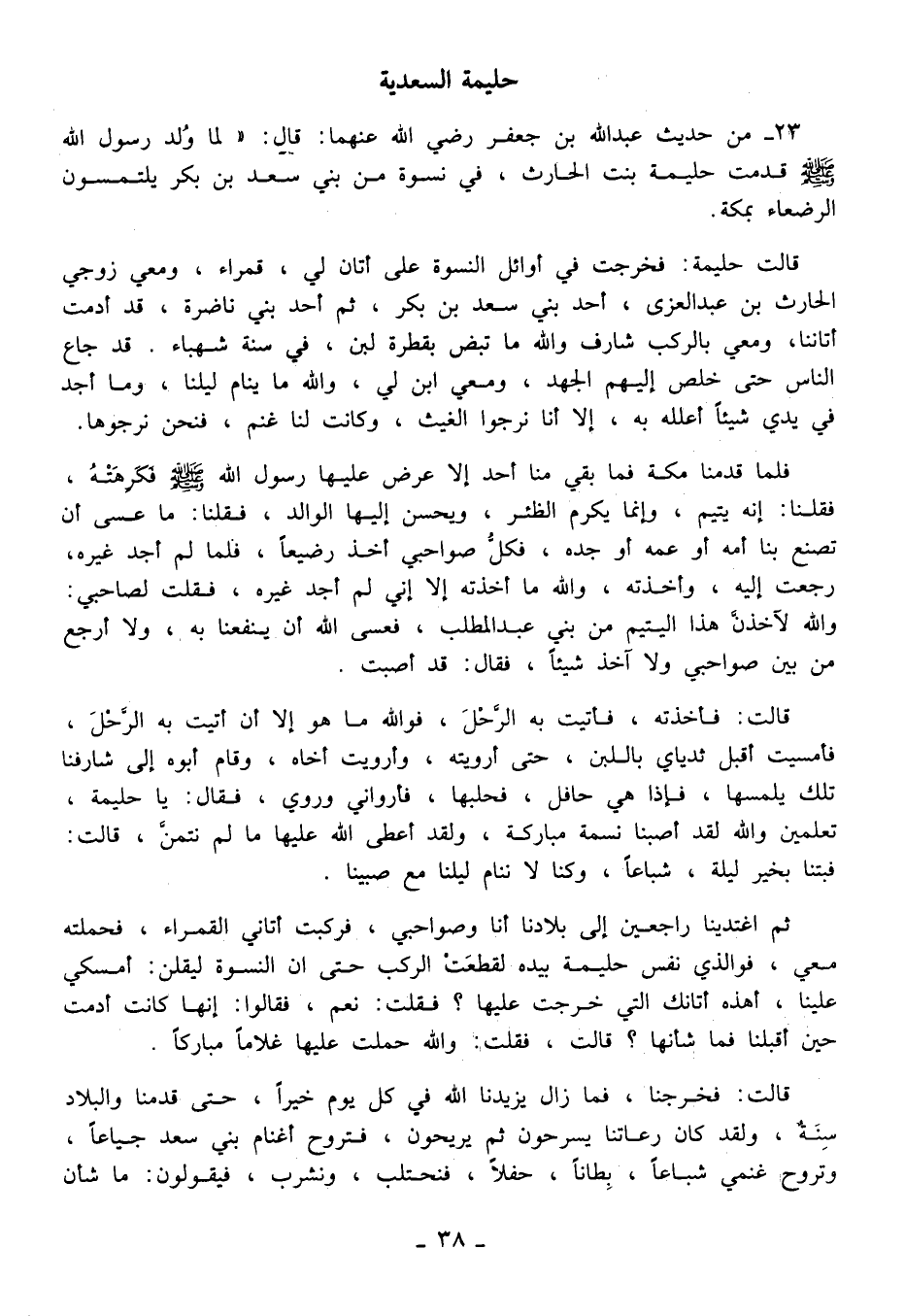 23 - من حديث عبد الله بن جعفر رضي الله عنهما: قال: "لما وُلد رسول الله - صلى الله عليه وسلم - قدمت حليمة بنت الحارث، في نسوة من بني سعد بن بكر يلتمسون الرضعاء بمكة.