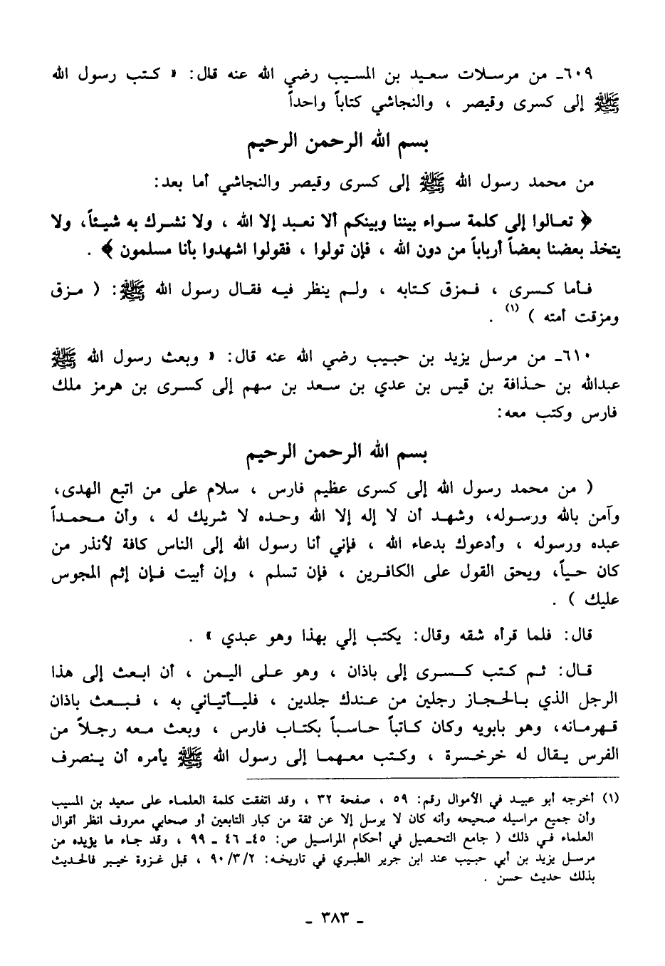 609 - من مرسلات سعيد بن المسيب رضي الله عنه قال: "كتب رسول الله - صلى الله عليه وسلم - إلى كسرى وقيصر، والنجاشي كتابًا واحدًا.