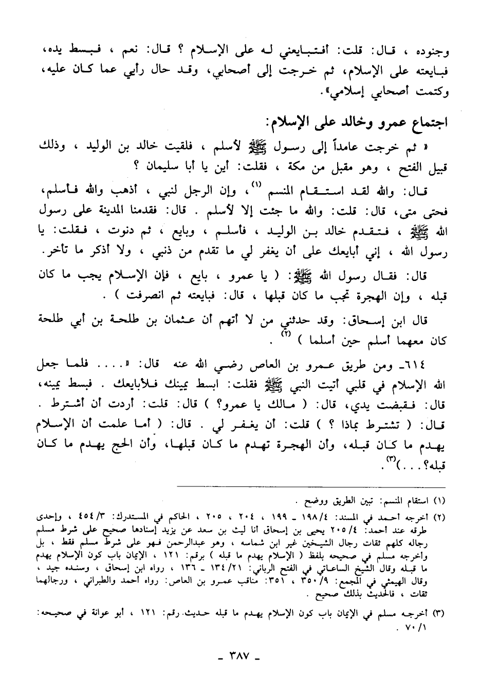 (¬2) أخرجه أحمد في المسند: 4/ 198 - 199، 204، 205، الحاكم في المستدرك: 3/ 454، وإحدى طرقه عند أحمد: 4/ 205 يحيى بن إسحاق أنا ليث بن سعد عن يزيد إسنادها صحيح على شرط مسلم رجاله كلهم ثقات رجال الشيخين غير ابن شماسه، وهو عبد الرحمن فهو على شرط مسلم فقط، بل وأخرجه مسلم في صحيحه بلفظ (الإِسلام يهدم ما قبله) برقم: 121، الإيمان باب كون الإِسلام يهدم ما قبله وقال الشيخ الساعاتي في الفتح الرجل: 21/ 134 - 136، رواه ابن إسحاق، وسنده جيد، وقال الهيثمي في المجمع: 9/ 350، 351: مناقب عمرو بن العاص: رواه أحمد والطبراني، ورجالهما ثقات، فالحديث بذلك صحيح.