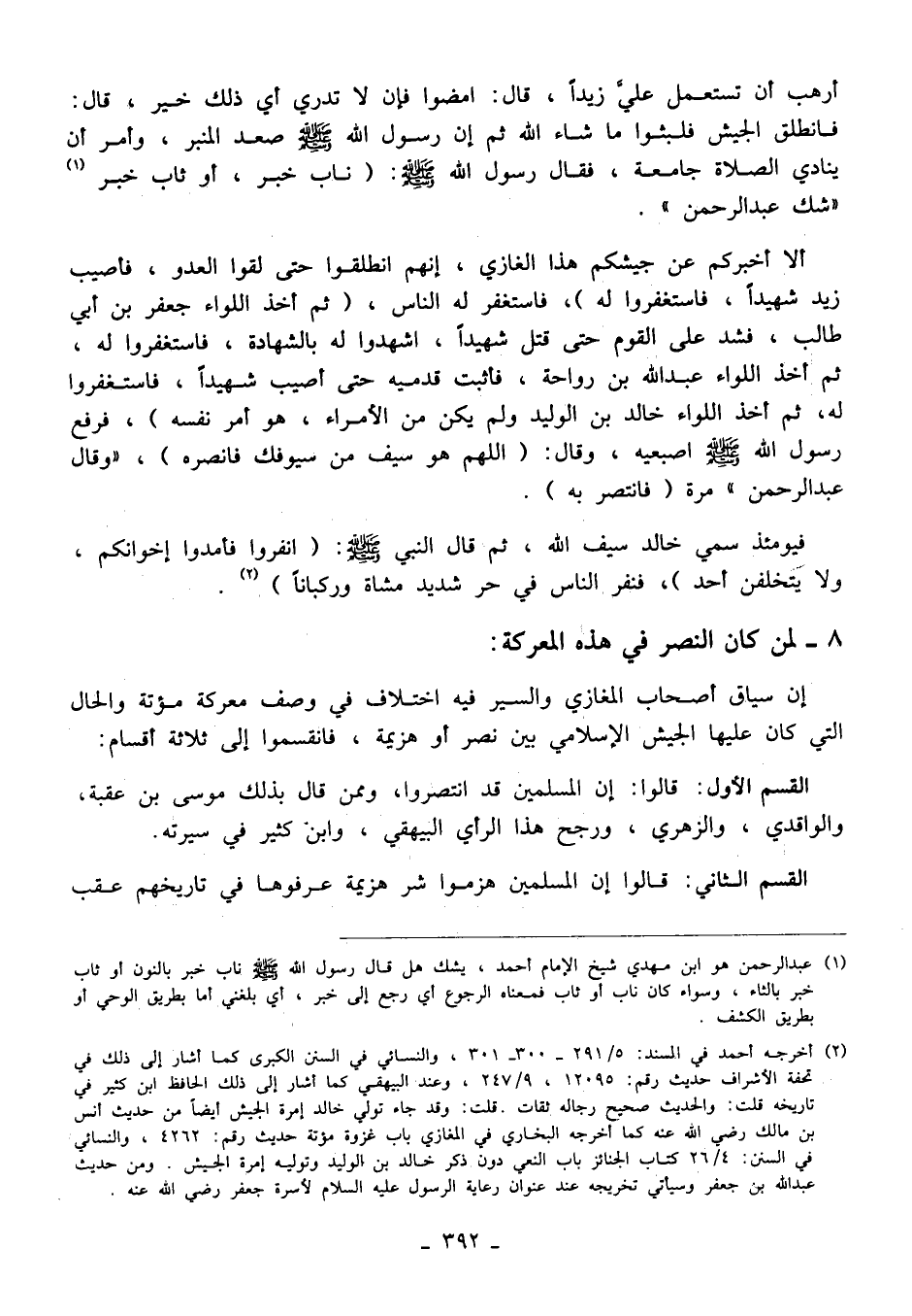 (¬2) أخرجه أحمد في المسند: 5/ 291 - 300 - 301، والنسائي في السنن الكبرى كما أشار إلى ذلك في تحفة الأشراف حديث رقم: 12095، 9/ 247، وعند البيهقي كما أشار إلى ذلك الحافظ ابن كثير في تاريخه قلت: والحديث صحيح رجاله ثقات. قلت: وقد جاء تولي خالد إمرة الجيش أيضًا من حديث أنس بن مالك رضي الله عنه كما أخرجه البخاري في المغازي باب غزوة مؤتة حديث رقم: 4262، والنسائي في السنن: 4/ 26 كتاب الجنائز باب النعي دون ذكر خالد بن الوليد وتوليه إمرة الجيش. ومن حديث عبد الله بن جعفر وسيأتي تخريجه عند عنوان رعاية الرسول - عليه السلام -، لأسرة جعفر رضي الله عنه.