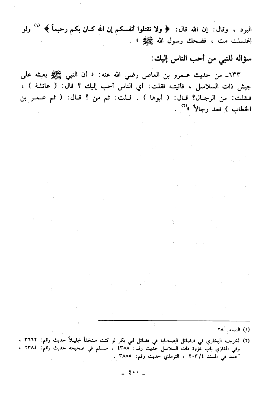 633 - من حديث عمرو بن العاص رضي الله عنه: "أن النبي - صلى الله عليه وسلم - بعثه على جيش ذات السلاسل، فأتيته فقلت: أي الناس أحب إليك؟ قال: (عائشة)، فقلت: من الرجال؟ قال: (أبوها). قلت: ثم من؟ قال: (ثم عمر بن الخطاب) فعد رجالًا" (¬2).