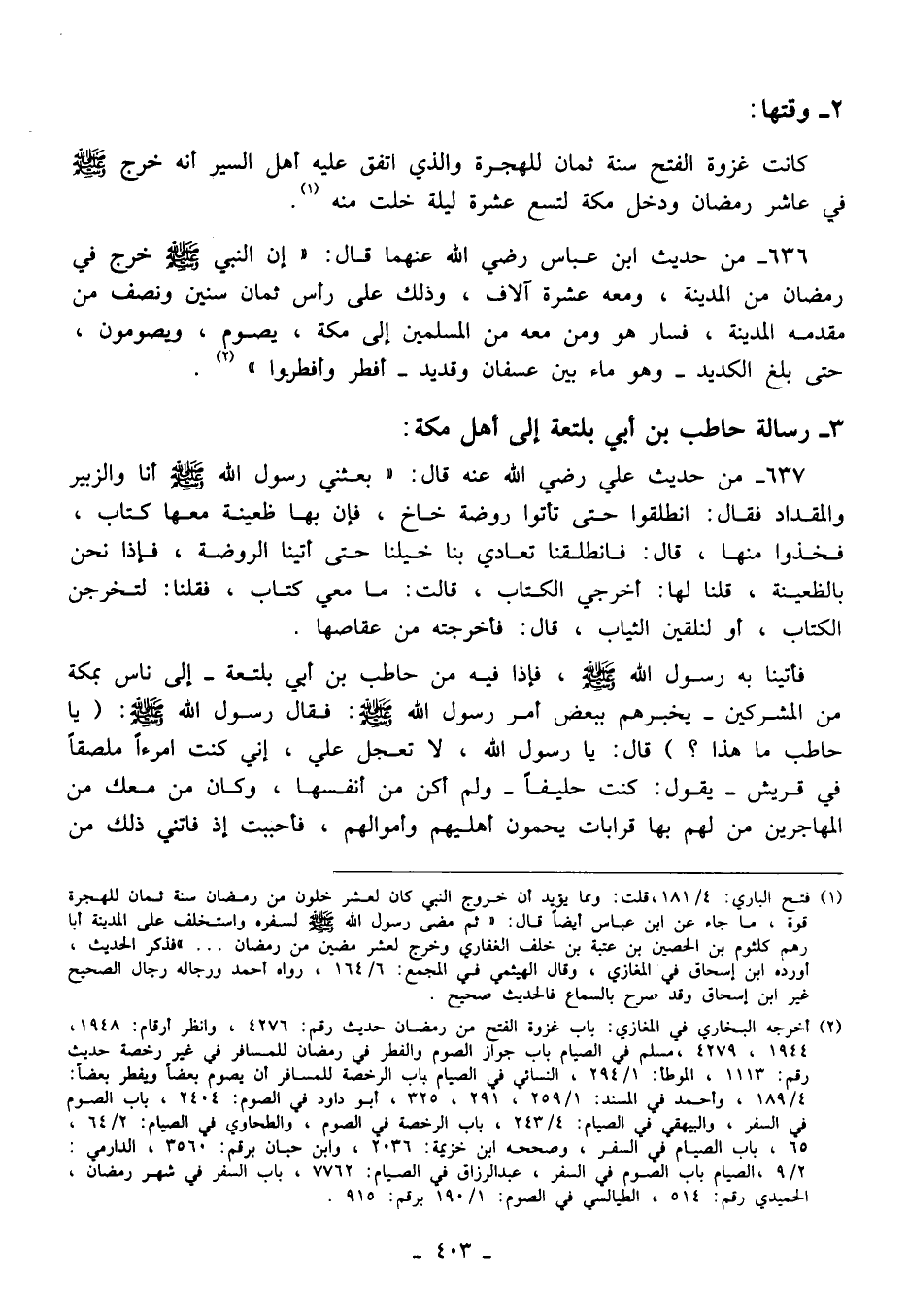 636 - من حديث ابن عباس رضي الله عنهما قال: "إن النبي - صلى الله عليه وسلم - خرج في رمضان من المدينة، ومعه عشرة آلاف، وذلك على رأس ثمان سنين ونصف من مقدمه المدينة، فسار هو ومن معه من المسلمين إلى مكة، يصوم، ويصومون، حتى بلغ الكديد -وهو ماء بين عسفان وقديد- أفطر وأفطروا" (¬2).