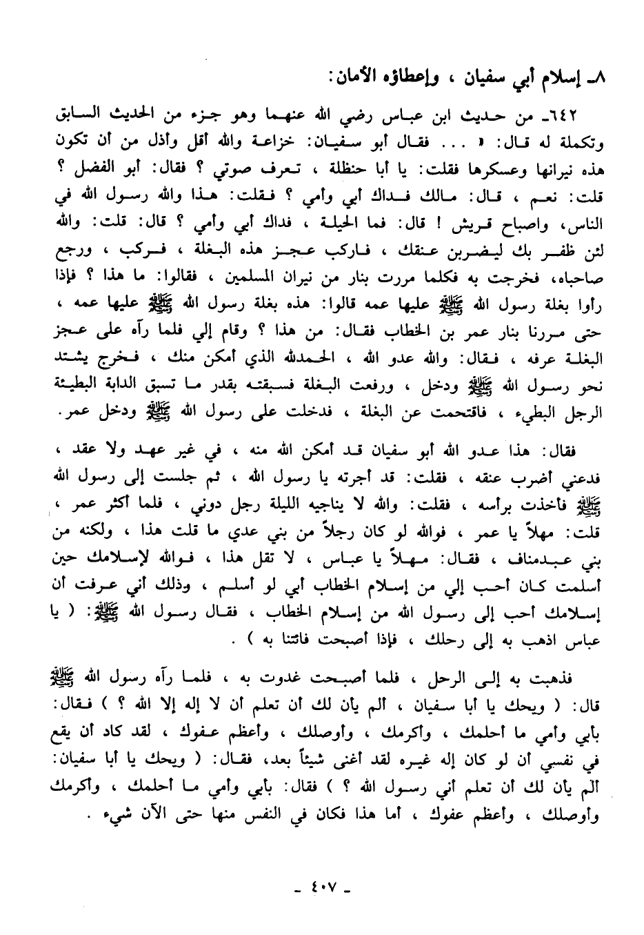 فقال: هذا عدو الله أبو سفيان قد أمكن الله منه، في غير عهد ولا عقد، فدعني أضرب عنقه، فقلت: قد أجرته يا رسول الله، ثم جلست إلى رسول الله - صلى الله عليه وسلم - فأخذت برأسه، فقلت: والله لا يناجيه الليلة رجل دوني، فلما أكثر عمر، قلت: مهلًا يا عمر، فوالله لو كان رجلًا من بني عدي ما قلت هذا، ولكنه من بني عبد مناف، فقال: مهلًا يا عباس، لا تقل هذا، فوالله لإسلامك حين أسلمت كان أحب إلي من إسلام الخطاب أبي لو أسلم، وذلك أني عرفت أن إسلامك أحب إلى رسول الله من إسلام الخطاب، فقال رسول الله - صلى الله عليه وسلم -: (يا عباس اذهب به إلى رحلك، فهذا أصبحت فائتنا به).