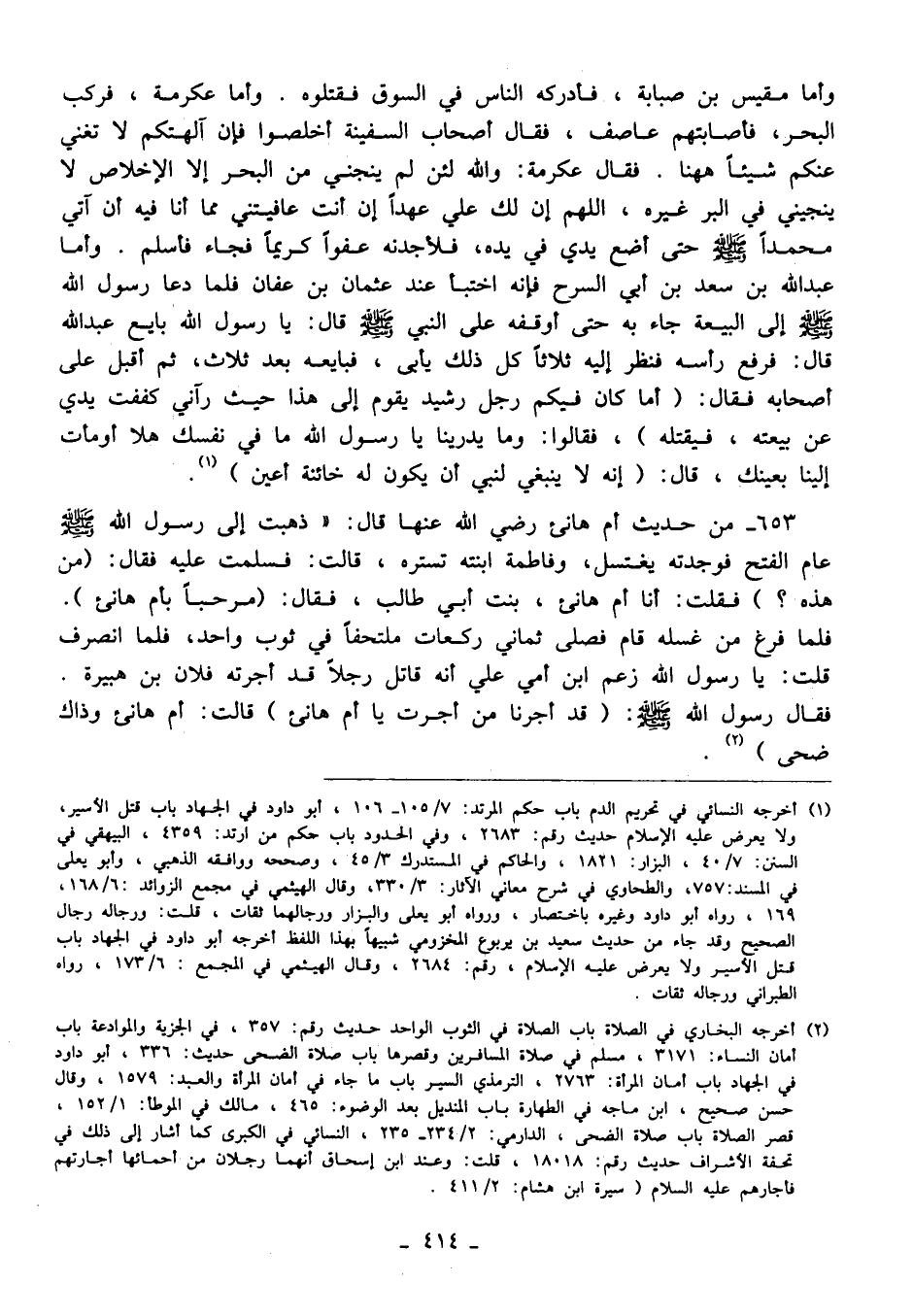 (¬1) أخرجه النسائي في تحريم الدم باب حكم المرتد: 7/ 105 - 106، أبو داود في الجهاد باب قتل الأسير، ولا يعرض عليه الإِسلام حديث رقم:2683، وفي الحدود باب حكم من ارتد: 4359، البيهقي في السنن: 7/ 40،البزار: 1821، والحاكم في المستدرك 3/ 45، وصححه ووافقه الذهبي، وأبو يعلى في المسند: 757، والطحاوي في شرح معاني الآثار: 3/ 330، وقال الهيثمي في مجمع الزوائد: 6/ 168، 169، رواه أبو داود وغيره باختصار، ورواه أبو يعلى والبزار، ورجالهما ثقات، قلت: ورجاله رجال الصحيح وقد جاء من حديث سعيد بن يربوع المخزومي شبيهًا بهذا اللفظ أخرجه أبو داود في الجهاد باب قتل الأسير ولا يعرض عليه الإِسلام، رقم: 2684، وقال الهيثمي في المجمع: 6/ 173، رواه الطبراني ورجاله ثقات.