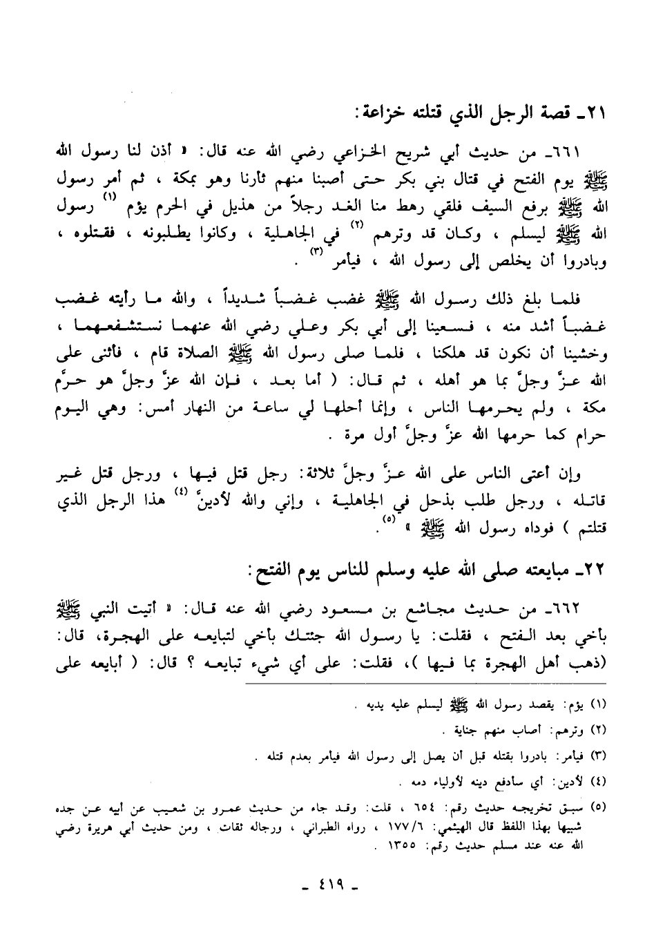 661 - من حديث أبي شريح الخزاعي رضي الله عنه قال: "أذن لنا رسول الله - صلى الله عليه وسلم - يوم الفتح في قتال بني بكر حتى أصبنا منهم ثأرنا وهو بمكة، ثم أمر رسول الله - صلى الله عليه وسلم - برفع السيف فلقي رهط منا الغد رجلًا من هذيل في الحرم يؤم (¬1) رسول الله - صلى الله عليه وسلم - ليسلم، وكان قد وترهم (¬2) في الجاهلية، وكانوا يطلبونه، فقتلوه، وبادروا أن يخلص إلى رسول الله، فيأمر (¬3).