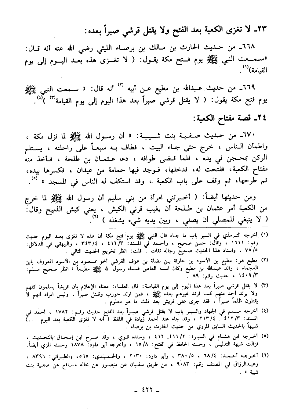 (¬4) أخرجه مسلم في الجهاد والسير باب لا يقتل قرشي صبرًا بعد الفتح حديث رقم: 1782، أحمد في المسند: 3/ 412 - 4/ 213، وقد جاء محمد أحمد زيادة في اللفظ (أنه لا تغزى الكعبة بعد اليوم ...) شبيهًا بالحدبث السابق المروي من حديث الحارث بن برصاء.