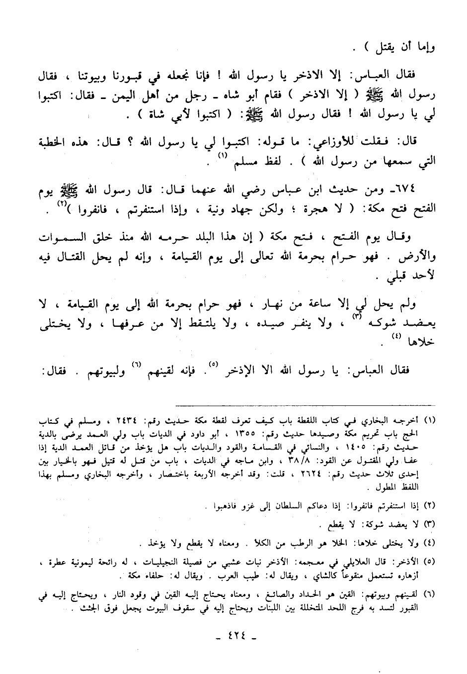 فقال العباس: إلا الاذخر يا رسول الله! فإنا نجعله في قبورنا وبيوتنا، فقال رسول الله - صلى الله عليه وسلم - (إلا الإذخر) فقام أبو شاه -رجل من أهل اليمن- فقال: اكتبوا لي يا رسول الله! فقال رسول الله - صلى الله عليه وسلم -: (اكتبوا لأبي شاة).