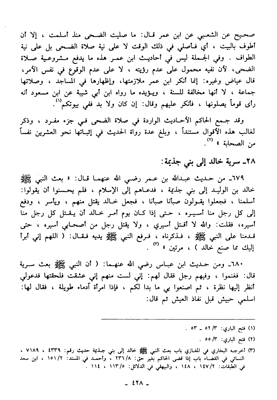 (¬3) أخرجه البخاري في المغازي باب بعث النبي - صلى الله عليه وسلم - خالد إلى بني جذيمة حديث رقم: 4339، 7189، النسائي في القضاء باب إذا قضى الحاكم بغير حق: 8/ 236، وأحمد في المسند: 2/ 151، ابن سعد في الطبقات: 2/ 147، 148، والبيهقي في الدلائل: 5/ 113، 114.