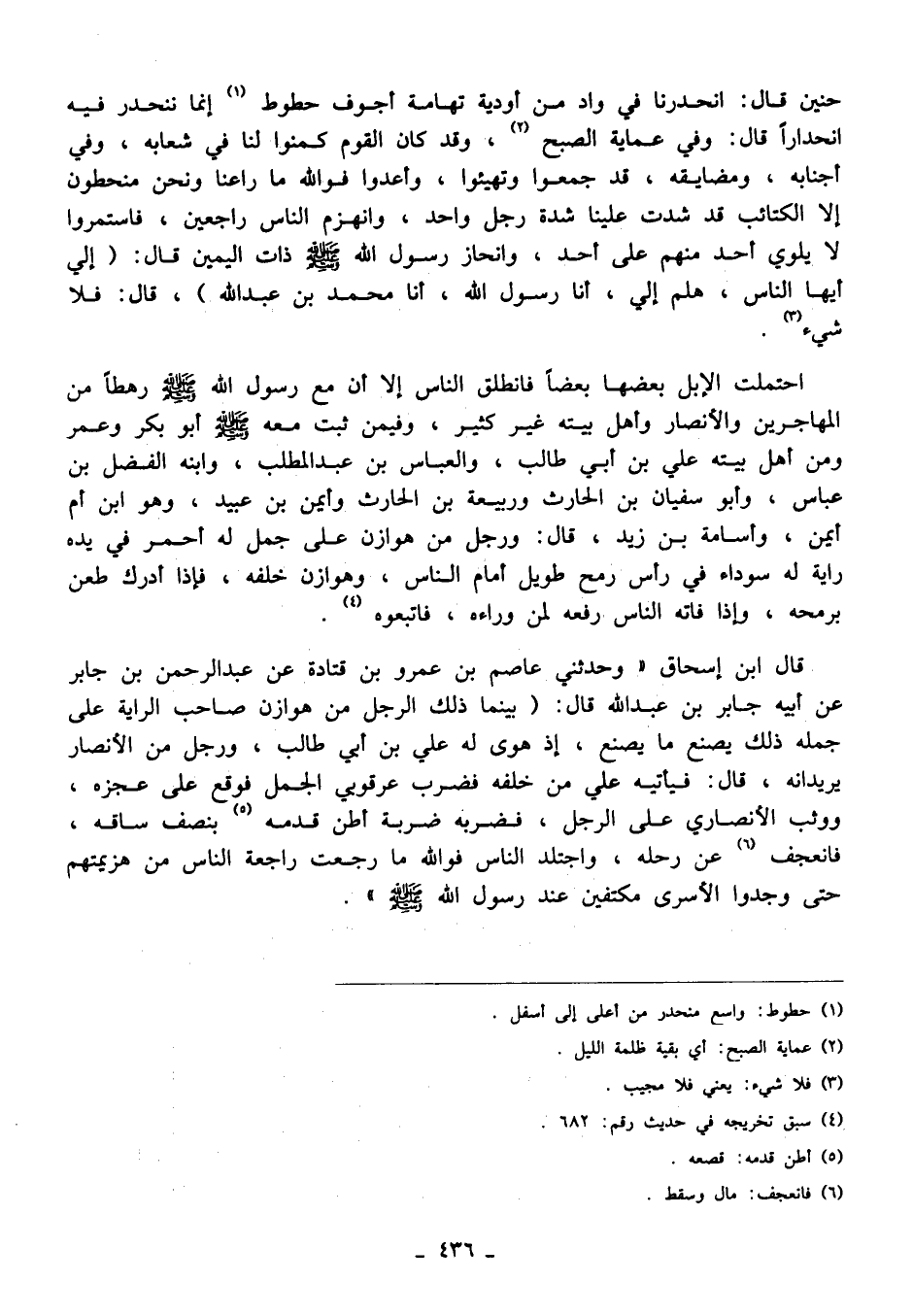 قال ابن إسحاق "وحدثني عاصم بن عمرو بن قتادة عن عبد الرحمن بن جابر عن أبيه جابر بن عبد الله قال: (بينما ذلك الرجل من هوازن صاحب الراية على جمله ذلك يصنع ما يصنع، إذ هوى له علي بن أبي طالب، ورجل من الأنصار يريدانه، قال: فيأتيه علي من خلفه فضرب عرقوبي الجمل فوقع على عجزه، ووثب الأنصاري على الرجل، فضربه ضربة أطن قدمه (¬5) بنصف ساقه، فانعجف (¬6) عن رحله، واجتلد الناس فوالله ما رجعت راجعة الناس من هزيمتهم حتى وجدوا الأسرى مكتفين عند رسول الله - صلى الله عليه وسلم -".