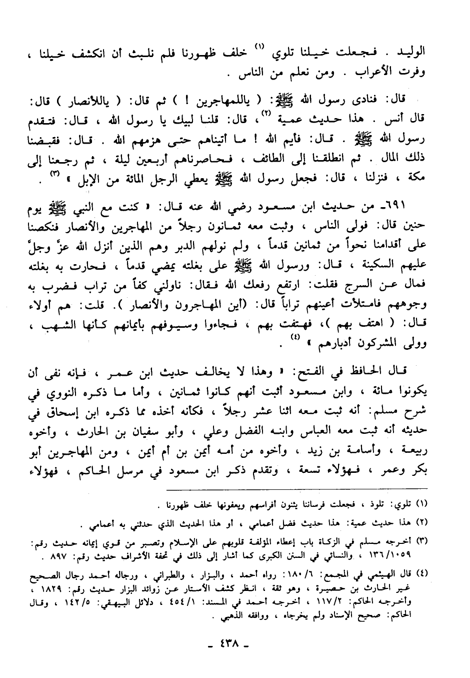 691 - من حديث ابن مسعود رضي الله عنه قال: "كنت مع النبي - صلى الله عليه وسلم - يوم حنين قال: فولى الناس، وثبت معه ثمانون رجلًا من المهاجرين والأنصار فنكصنا على أقدامنا نحوًا من ثمانين قدمًا، ولم نولهم الدبر وهم الذين أنزل الله عَزَّ وَجَلَّ عليهم السكينة، قال: ورسول الله - صلى الله عليه وسلم - على بغلته يمضي قدمًا، فحارت به بغلته فمال عن السرج فقلت: ارتفع رفعك الله فقال: ناولني كفًّا من تراب فضرب به وجوههم فامتلأت أعينهم ترابًا قال: (أين المهاجرون والأنصار). قلت: هم أولاء قال: (اهتف بهم)، فهتفت بهم، فجاءوا وسيوفهم بأيمانهم كأنها الشهب، وولى المشركون أدبارهم" (¬4).