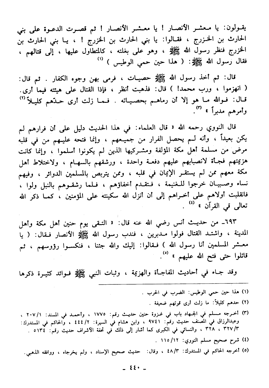 (¬3) أخرجه مسلم في الجهاد باب في غزوة حنين حديث رقم: 1775، وأحمد في المسند: 7/ 201، وعبد الرزاق في المصنف حديث رقم: 9741، وابن هشام في السيرة: 2/ 444، والحاكم في المستدرك: 3/ 327، 328، والنسائي في الكبرى كما أشار إلى ذلك في تحفة الأشراف حديث رقم: 5134.