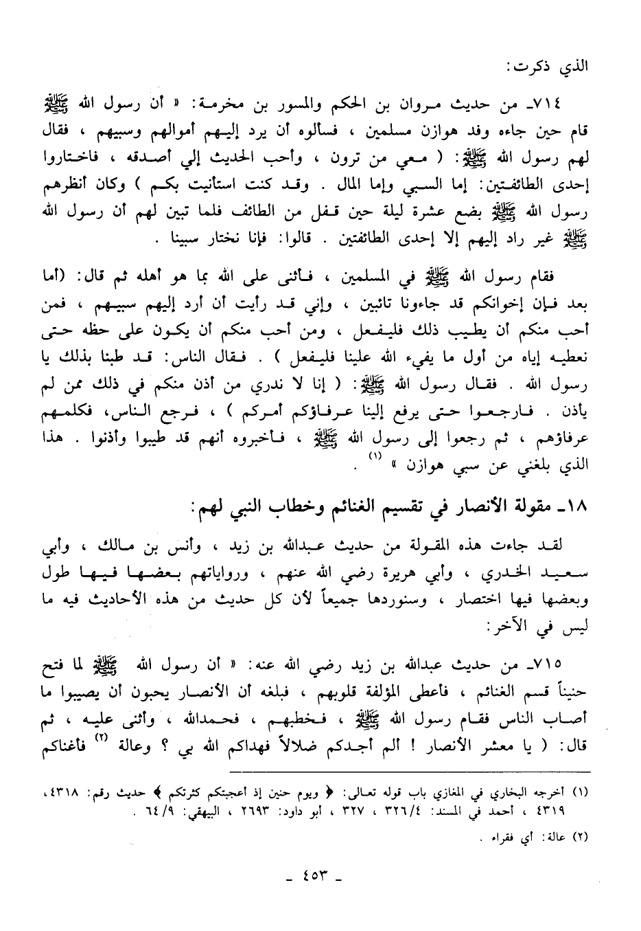 715 - من حديث عبد الله بن زيد رضي الله عنه: "أن رسول الله - صلى الله عليه وسلم - لما فتح حنينًا قسم الغنائم، فأعطى المؤلفة قلوبهم، فبلغه أن الأنصار يحبون أن يصيبوا ما أصاب الناس فقام رسول الله - صلى الله عليه وسلم -، فخطبهم، فحمد الله، وأثنى عليه، ثم قال: (يا معشر الأنصار! ألم أجدكم ضلالًا فهداكم الله بي؟ وعالة (¬2) فأغناكم
