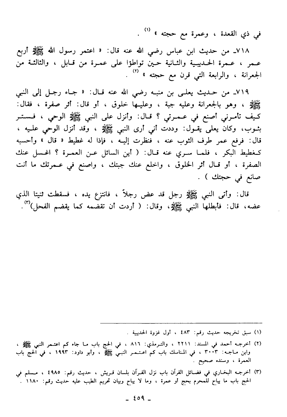 719 - من حديث يعلى بن منبه رضي الله عنه قال: "جاء رجل إلى النبي - صلى الله عليه وسلم -، وهو بالجعرانة وعليه جبة، وعليها خلوق، أو قال: أثر صفرة، فقال: كيف تأمرني أصنع في عمرتي؟ قال: وأنزل على النبي - صلى الله عليه وسلم - الوحي، فستر بثوب، وكان يعلى يقول: وددت أني أرى النبي - صلى الله عليه وسلم -، وقد أنزل الوحي عليه، قال: فرفع عمر طرف الثوب عنه، فنظرت إليه، فإذا له غطيط "قال" وأحسبه كغطيط البكر، فلما سري عنه قال: (أين السائل عن العمرة؟ اغسل عنك الصفرة، أو قال أثر الخلوق، واخلع عنك جبتك، واصنع في عمرتك ما أنت صانع في حجتك).