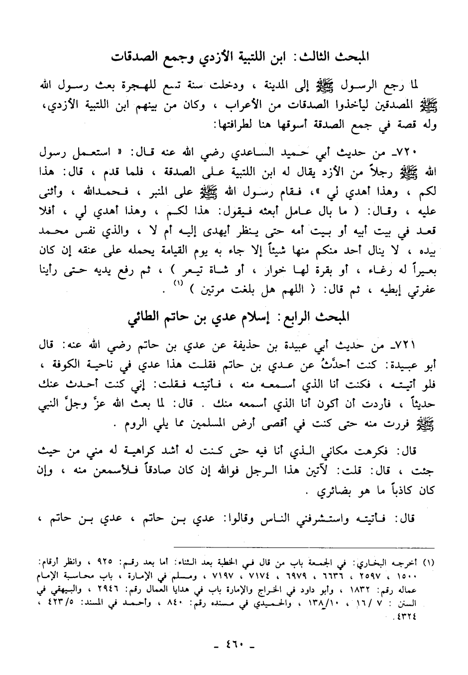 (¬1) أخرجه البخاري: في الجمعة باب من قال في الخطبة بعد الثناء: أما بعد رقم: 925، وانظر أرقام: 1500، 2597، 6636، 6979، 7174، 7197، ومسلم في الإمارة، باب محاسبة الإِمام عماله رقم: 1832، وأبو داود في الخراج والإمارة باب في هدايا العمال رقم: 2946، والبيهقي في السنن 7/ 16، 10/ 138، والحميدي في مسنده رقم: 840، وأحمد في المسند: 5/ 423، 4324.