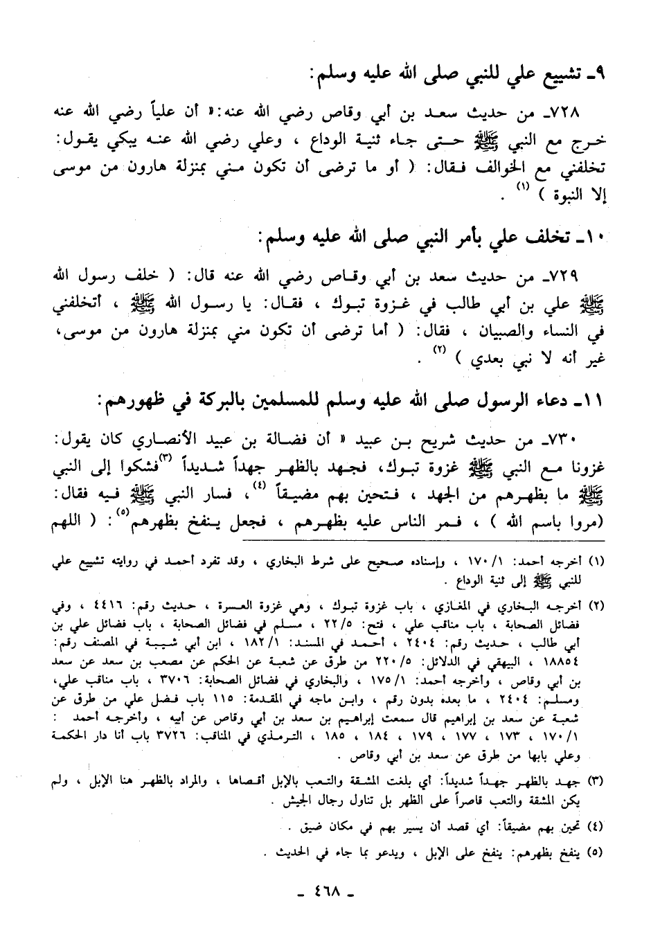729 - من حديث سعد بن أبي وقاص رضي الله عنه قال: (خلف رسول الله - صلى الله عليه وسلم - علي بن أبي طالب في غزوة تبوك، فقال: يا رسول الله - صلى الله عليه وسلم -، أتخلفني في النساء والصبيان، فقال: (أما ترضى أن تكون مني بمنزلة هارون من موسى، غير أنه لا نبي بعدي) (¬2).