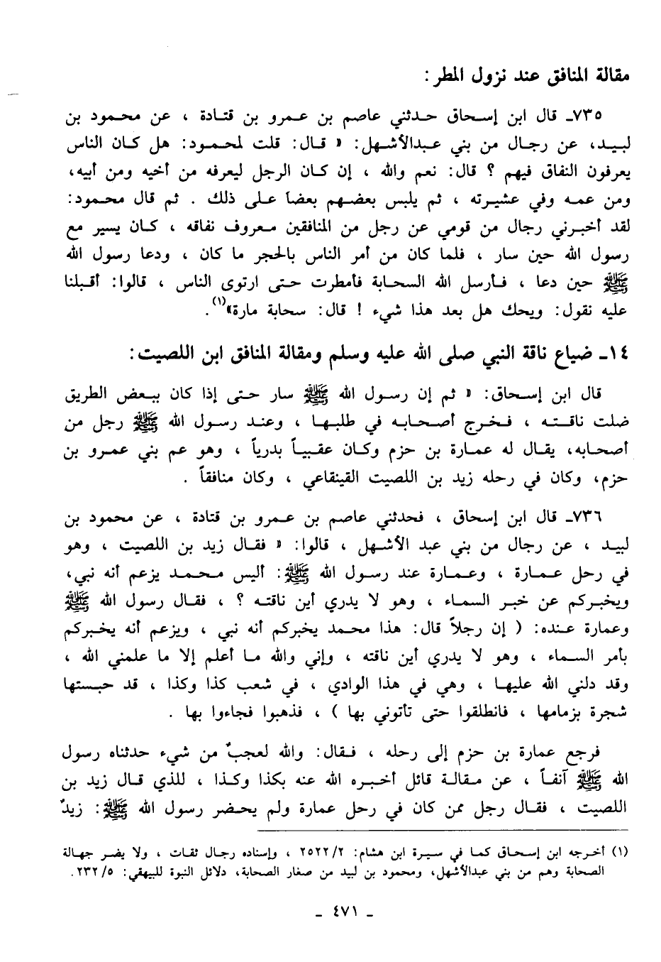 736 - قال ابن إسحاق، فحدثني عاصم بن عمرو بن قتادة، عن محمود بن لبيد، عن رجال من بني عبد الأشهل، قالوا: "فقال زيد بن اللصيت، وهو في رحل عمارة، وعمارة عند رسول الله - صلى الله عليه وسلم -: أليس محمد يزعم أنه نبي، ويخبركم عن خبر السماء، وهو لا يدري أين ناقته؟، فقال رسول الله - صلى الله عليه وسلم - وعمارة عنده: (إن رجلًا قال: هذا محمد يخبركم أنه نبي، ويزعم أنه يخبركم بأمر السماء، وهو لا يدري أين ناقته، وإني والله ما أعلم إلا ما علمني الله، وقد دلني الله عليها، وهي في هذا الوادي، في شعب هذا وكذا، قد حبستها شجرة بزمامها، فانطلقوا حتى تأتوني بها)، فذهبوا فجاءوا بها.