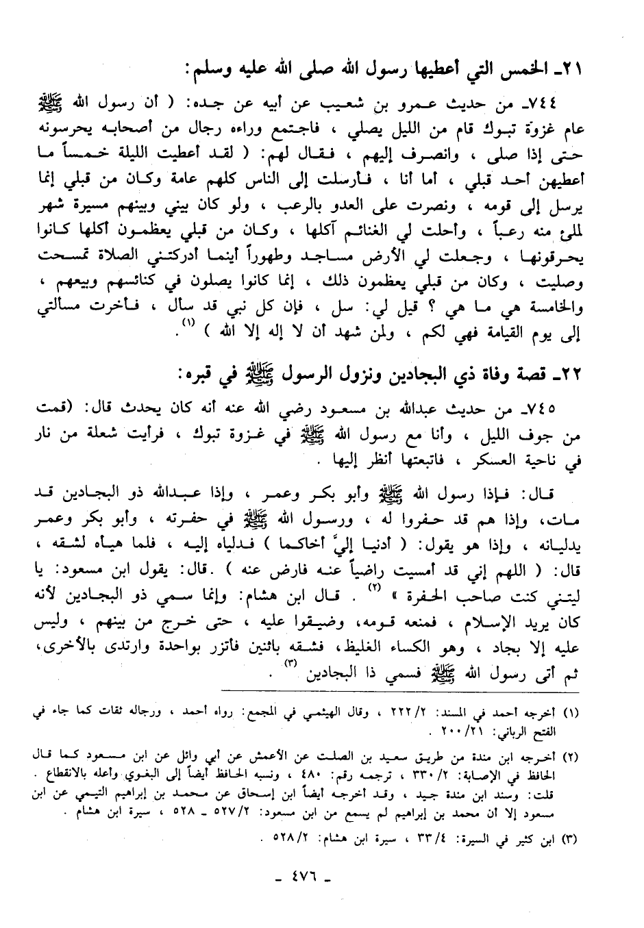 744 - من حديث عمرو بن شعيب عن أبيه عن جده: (أن رسول الله - صلى الله عليه وسلم - عام غزوة تبوك قام من الليل يصلي، فاجتمع وراءه رجال من أصحابه يحرسونه حتى إذا صلى، وانصرف إليهم، فقال لهم: "لقد أعطيت الليلة خمسًا ما أعطيهن أحد قبلي، أما أنا، فأرسلت إلى الناس كلهم عامة وكان من قبلي إنما برسل إلى قومه، ونصرت على العدو بالرعب، ولو كان بيني وبينهم مسيرة شهر لمليء منه رعبًا، وأحلت لي الغنائم آكلها، وكان من قبلي يعظمون أكلها كانوا يحرقونها، وجعلت لي الأرض مساجد وطهورًا أينما أدركتني الصلاة تمسحت وصليت، وكان من قبلي يعظمون ذلك، إنما كانوا يصلون في كنائسهم وبيعهم، والخامسة هي ما هي؟ قل لي: سل، فإن كل نبي قد سأل، فأخرت مسألتي إلى يوم القيامة فهي لكم، ولمن شهد أن لا إله إلا الله) (¬1).