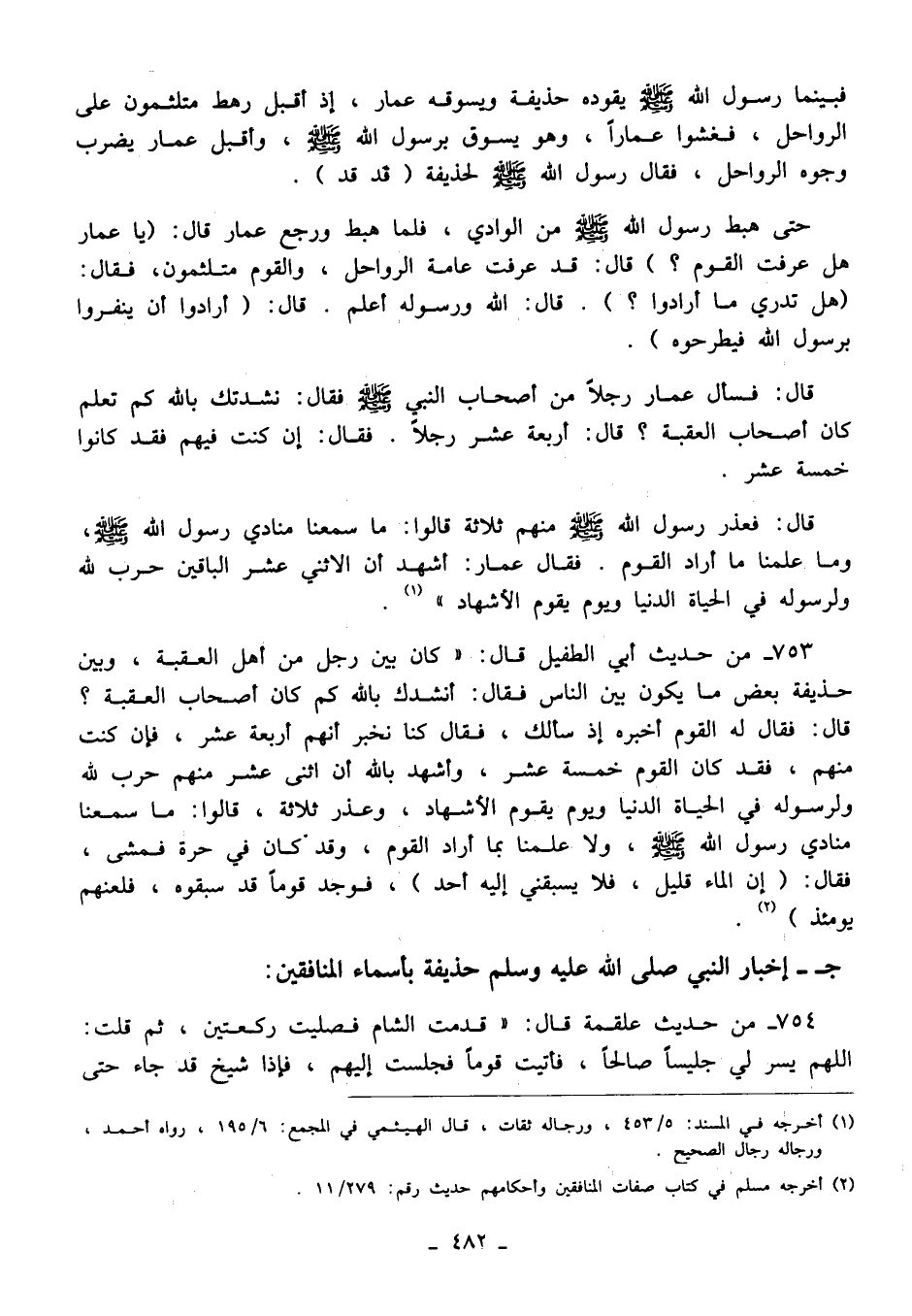 753 - من حديث أبي الطفيل قال: "كان بين رجل من أهل العقبة، وبين حذيفة بعض ما يكون بين الناس فقال: أنشدك بالله كم كان أصحاب العقبة؟ قال: فقال له القوم أخبره إذ سألك، فقال كنا نخبر أنهم أربعة عشر، فإن كنت منهم، فقد كان القوم خمسة عشر، وأشهد بالله أن اثنى عشر منهم حرب لله ولرسوله في الحياة الدنيا ويوم يقوم الأشهاد، وعذر ثلاثة، قالوا: ما سمعنا منادي رسول الله - صلى الله عليه وسلم -، ولا علمنا بما أراد القوم، وقد كان في حرة فمشى، فقال: (إن الماء قليل، فلا يسبقني إليه أحد)، فوجد قومًا قد سبقوه، فلعنهم يومئذ) (¬2).