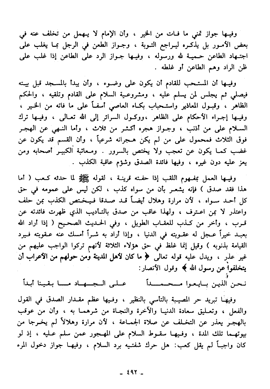 وفيها تبريد حر المصيبة بالتأسي بالنظير، وفيها عظم مقدار الصدق في القول والفعل، وتعليق سعادة الدنيا والآخرة والنجاة من شرهما به، وأن من عوقب بالهجز يعذر عن التخلف عن صلاة الجماعة، لأن مرارة وهلالًا لم يخرجا من بيوتهما تلك المدة، وفيها سقوط السلام على المهجور عمن سلم عليه، إذ لو كان واجبًا لم يقل كعب: هل حرك شفتيه برد السلام، وفيها جواز دخول المرء