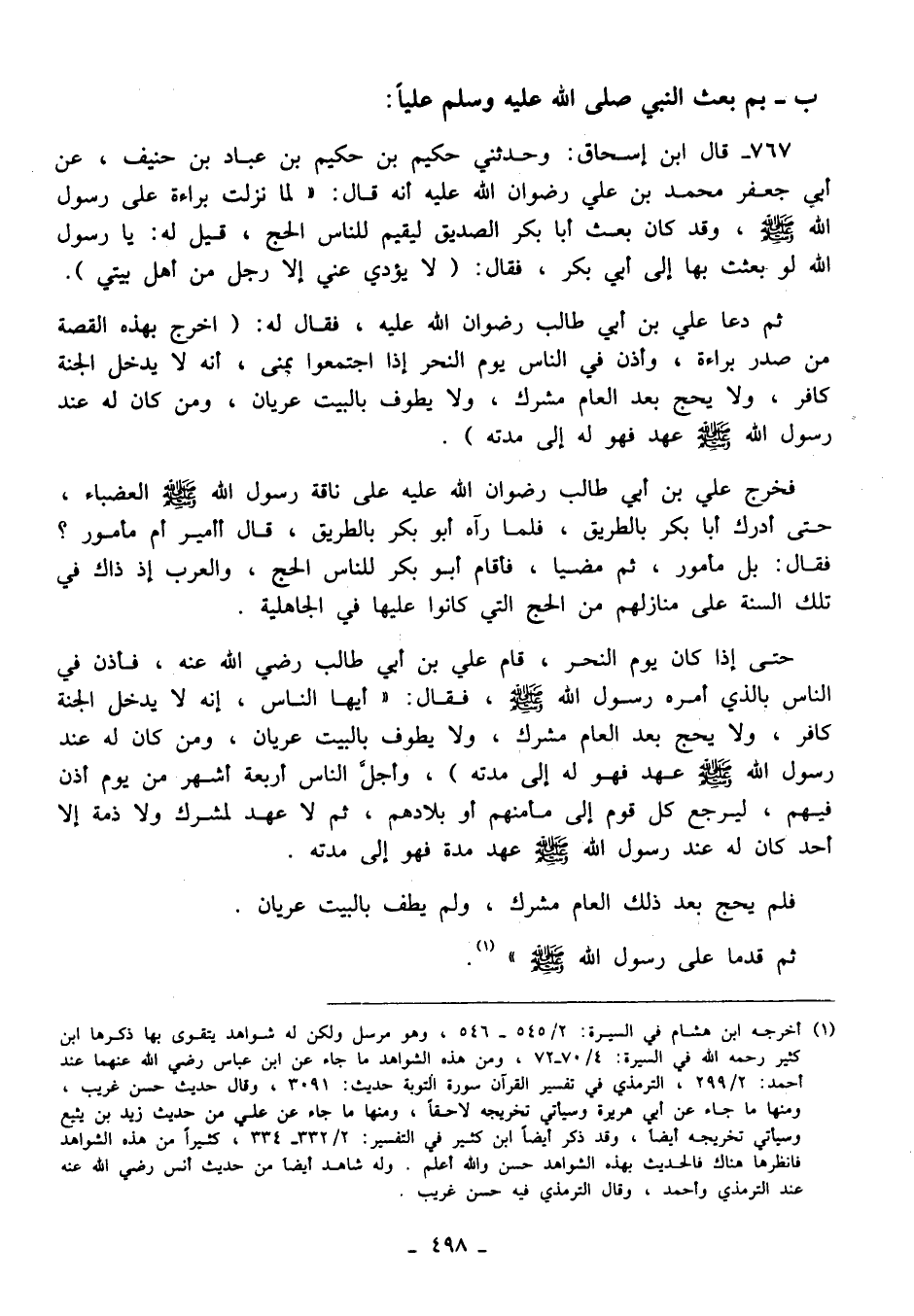 767 - قال ابن إسحاق: وحدثني حكيم بن حكيم بن عباد بن حنيف، عن أبي جعفر محمد بن علي رضوان الله عليه أنه قال: "لما نزلت براءة على رسول الله - صلى الله عليه وسلم -، وقد كان بعث أبا بكر الصديق ليقيم للناس الحج، قيل له: يا رسول الله لو بعثت بها إلى أبي بكر، فقال: (لا يؤدي عني إلا رجل من أهل بيتي).