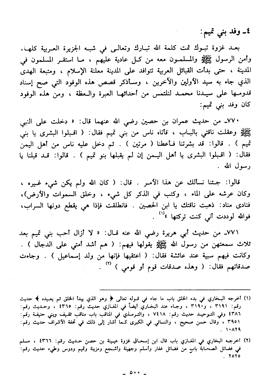 770 - من حديث عمران بن حصين رضي الله عنهما قال: "دخلت على النبي - صلى الله عليه وسلم - وعقلت ناقتي بالباب، فأتاه ناس من بني تميم فقال: (اقبلوا البشرى يا بني تميم). قالوا: قد بشرتنا فأعطنا (مرتين). ثم دخل عليه ناس من أهل اليمن فقال: (اقبلوا البشرى يا أهل اليمن إن لم يقبلها بنو تميم). قالوا: قد قبلنا يا رسول الله.