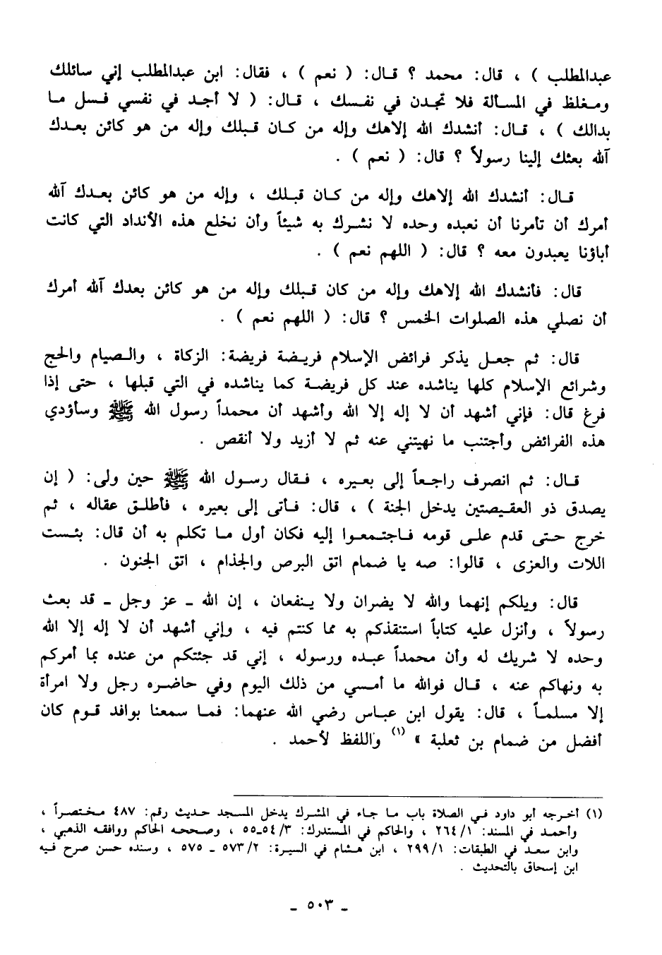 عبد المطلب"، قال: محمَّد؟ قال: (نعم)، فقال: ابن عبد المطلب إني سائلك ومغلظ في المسألة فلا تجدن في نفسك، قال: "لا أجد في نفسي فسل ما بدا لك"، قال: أنشدك الله إلاهك وإله من كان قبلك وإله من هو كائن بعدك آلله بعثك الينا رسولًا؟ قال: "نعم".