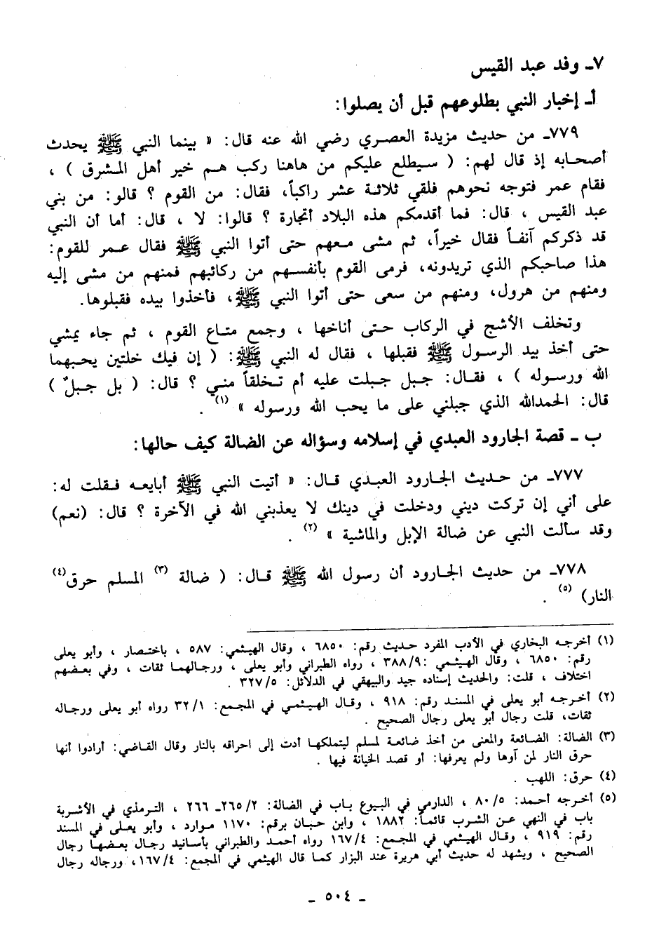 777 - من حديث الجارود العبدي قال: "أتيت النبي - صلى الله عليه وسلم - أبايعه فقلت له: على أني إن تركت ديني ودخلت في دينك لا يعذبني الله في الآخرة؟ قال: "نعم" وقد سألت النبي عن ضالة الإبل والماشية" (¬2).