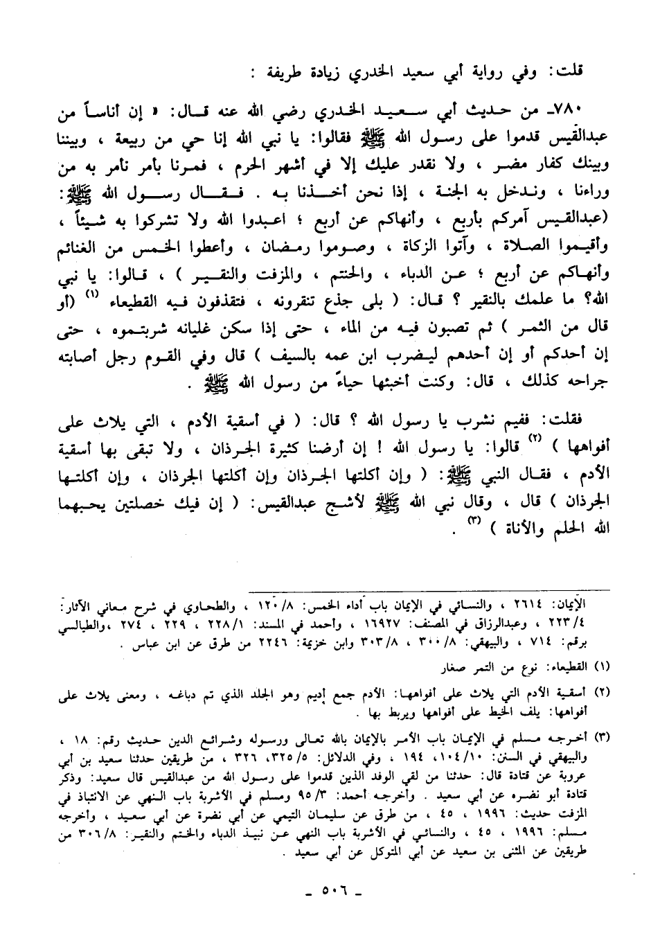 780 - من حديث أبي سعيد الخدري رضي الله عنه قال: "إن أناسًا من عبد القيس قدموا على رسول الله - صلى الله عليه وسلم - فقالوا: يا نبي الله إنا حي من ربيعة، وبيننا وبينك كفار مضر، ولا نقدر عليك إلا في أشهر الحرم، فمرنا بأمر نأمر به من وراءنا، وندخل به الجنة، إذا نحن أخذنا به. فقال رسول الله - صلى الله عليه وسلم -: "عبد القيس آمركم بأربع، وأنهاكم عن أربع؛ اعبدوا الله ولا تشركوا به شيئًا، وأقيموا الصلاة، وآتوا الزكاة، وصوموا رمضان، وأعطوا الخمس من الغنائم وأنهاكم عن أربع؛ عن الدباء، والحنتم، والمزفت والنقير"، قالوا: يا نبي الله؟ ما علمك بالنقير؟ قال: "بلى جذع تنقرونه، فتقذفون فيه القطيعاء (¬1) (أو قال من الثمر) ثم تصبون فيه من الماء، حتى إذا سكن غليانه شربتموه، حتى إن أحدكم أو إن أحدهم ليضرب ابن عمه بالسيف" قال وفي القوم رجل أصابته جراحه كذلك، قال: وكنت أخبئها حياءً من رسول الله - صلى الله عليه وسلم -.