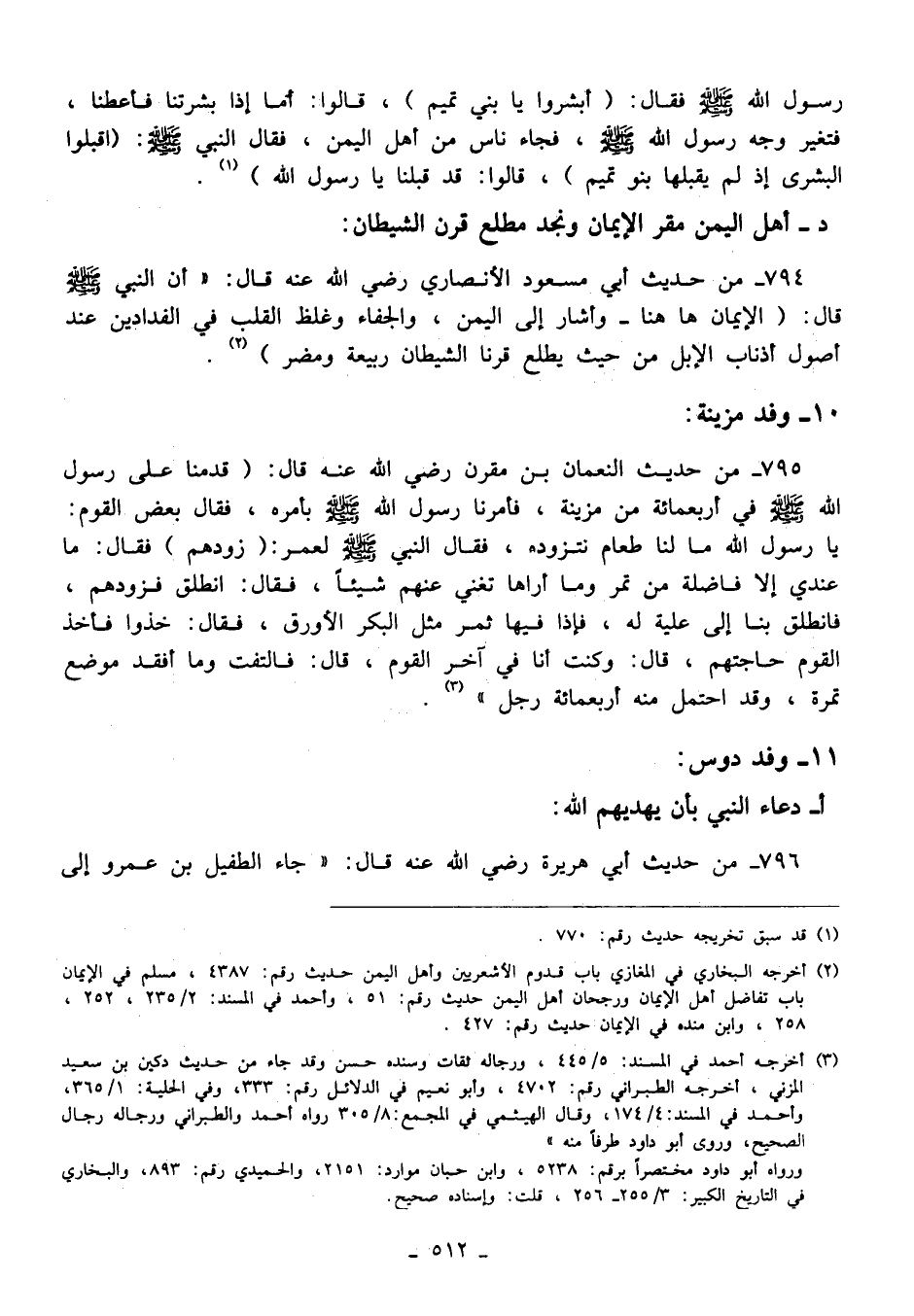 794 - من حديث أبي مسعود الأنصاري رضي الله عنه قال: "أن النبي - صلى الله عليه وسلم - قال: "الإيمان ها هنا- وأشار إلى اليمن، والجفاء وغلظ القلب في الفدادين عند أصول أذناب الإبل من حيث يطلع قرنا الشيطان ربيعة ومضر" (¬2).
