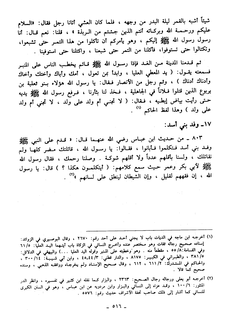 803 - من حديث ابن عباس رضي الله عنهما قال: "قدم على النبي - صلى الله عليه وسلم - وفد بني أسد فتكلموا فأبانوا، فقالوا: يا رسول الله، قاتلتك مضر كلها ولم نقاتلك، ولسنا بأقلهم عددًا ولا أقلهم شوكة. وصلنا رحمك، فقال رسول الله - صلى الله عليه وسلم - لأبي بكر وعمر حيث سمع كلامهم: "أيتكلمون هكذا؟ " قال: يا رسول الله، إن فقههم لقليل، وإن الشيطان لينطق على لسانهم" (¬2).
