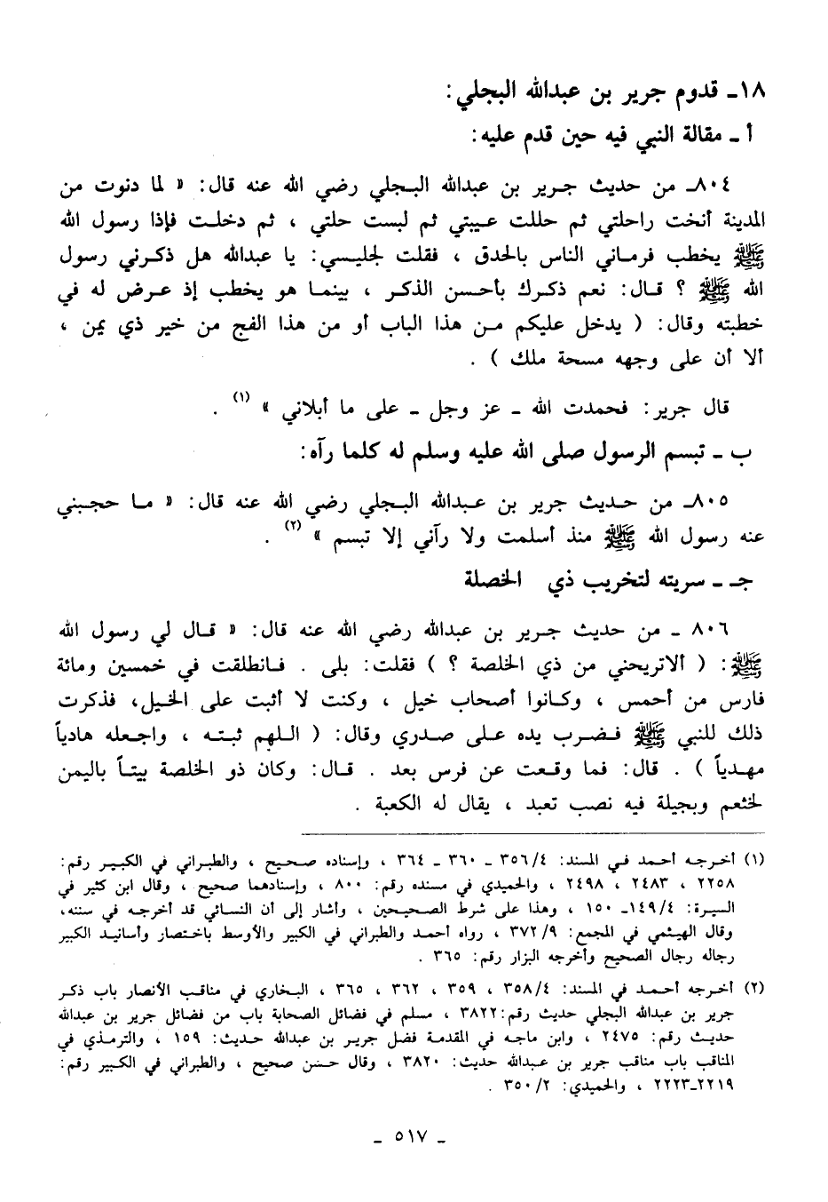 804 - من حديث جرير بن عبد الله البجلي رضي الله عنه قال: "لما دنوت من المدينة أنخت راحلتي دم حللت عيبتي ثم لبست حلتي، ثم دخلت فإذا رسول الله - صلى الله عليه وسلم - يخطب فرماني الناس بالحدق، فقلت لجليسي: يا عبد الله هل ذكرني رسول الله - صلى الله عليه وسلم -؟ قال: نعم ذكرك بأحسن الذكر، بينما هو يخطب إذ عرض له في خطبته وقال: "يدخل عليكم من هذا الباب أو من هذا الفج من خير ذي يمن، ألا أن على وجهه مسحة ملك".