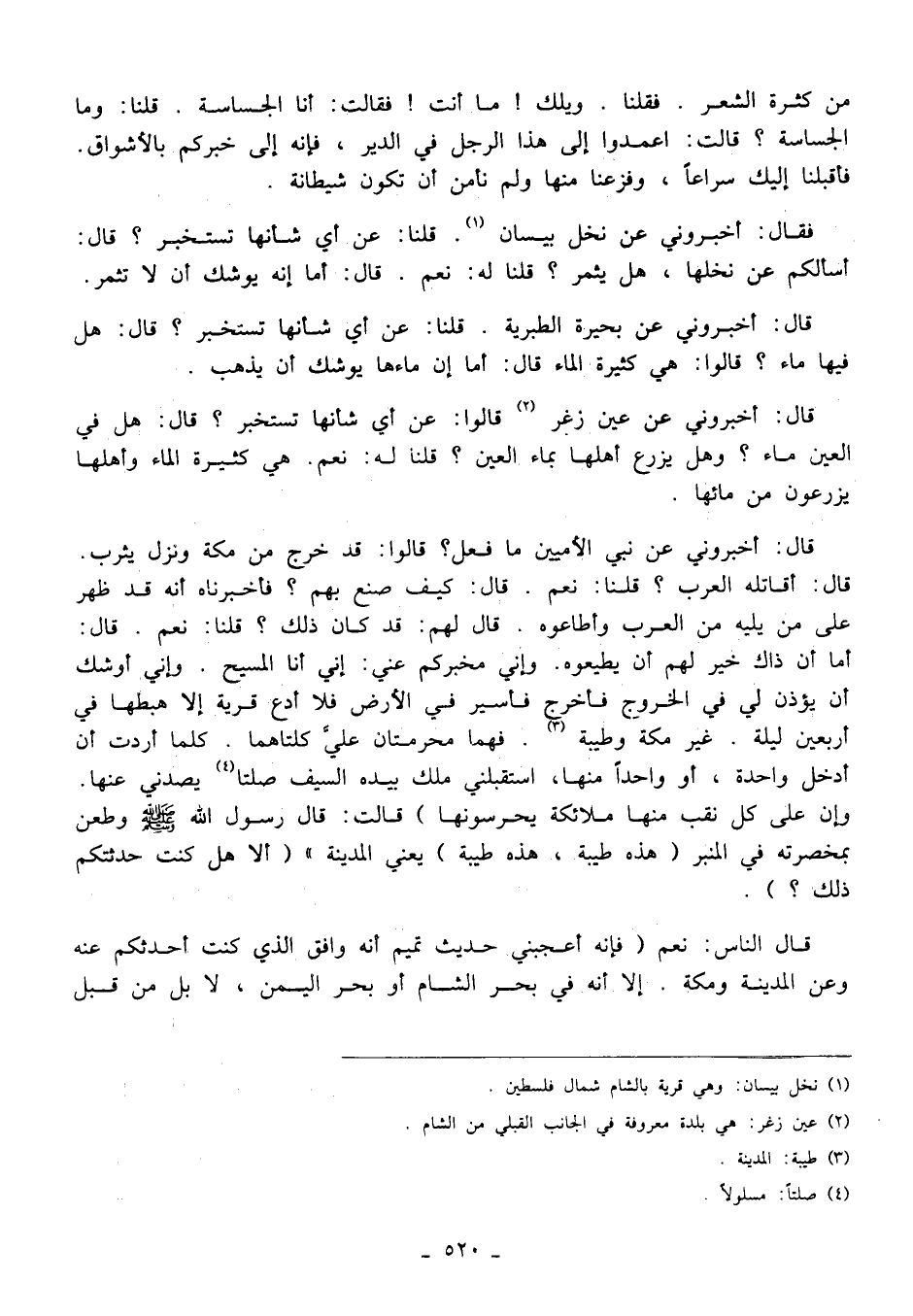 قال: أخبروني عن نبي الأميين ما فعل؟ قالوا: قد خرج من مكة ونزل يثرب. قال: أقاتله العرب؟ قلنا: نعم. قال: كيف صنع بهم؟ فأخبرناه أنه قد ظهر على من يليه من العرب وأطاعوه. قال لهم: قد كان ذلك؟ قلنا: نعم. قال: أما أن ذاك خير لهم أن يطيعوه. وإني مخبركم عني: إني أنا المسيح. وإني أوشك أن يؤذن لي في الخروج فأخرج فأسير في الأرض فلا أدع قرية إلا هبطها في أربعين ليلة. غير مكة وطيبة (¬3). فهما محرمتان عليَّ كلتاهما. كما أردت أن أدخل واحدة، أو واحدًا منها، استقبلني ملك بيده السيف صلتا (¬4) يصدني عنها. وإن على كل نقب منها ملائكة يحرسونها) قالت: قال رسول الله - صلى الله عليه وسلم - وطعن بمخصرته في المنبر (هذه طيبة، هذه طيبة) يعني المدينة" "ألا هل كنت حدثتكم ذلك؟ ".