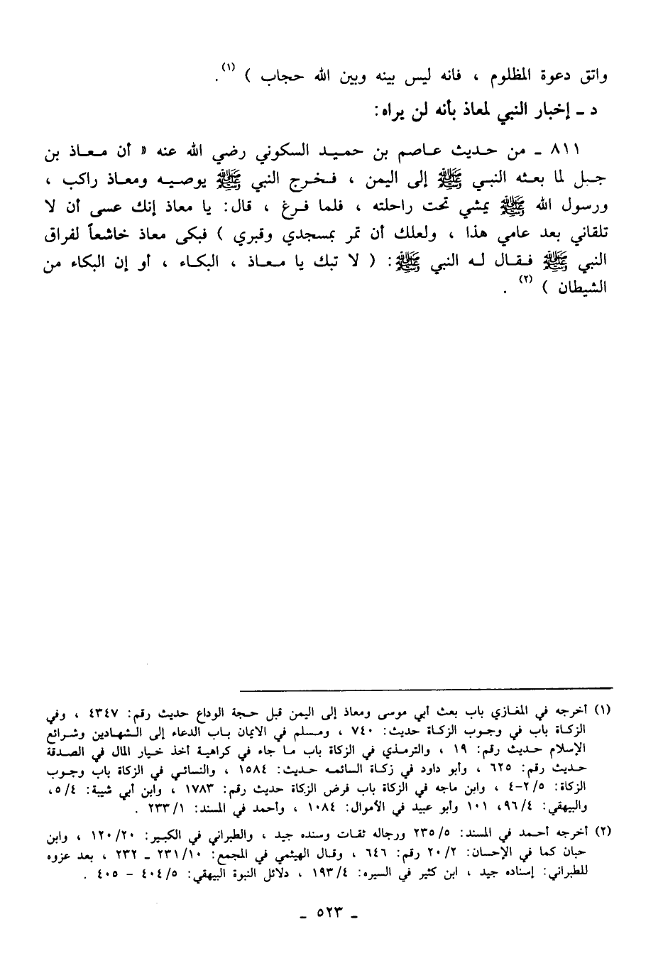 811 - من حديث عاصم بن حميد السكوني رضي الله عنه "أن معاذ بن جبل لما بعثه النبي - صلى الله عليه وسلم - إلى اليمن، فخرج النبي - صلى الله عليه وسلم - يوصيه ومعاذ راكب، ورسول الله - صلى الله عليه وسلم - يمشي تحت راحلته، فلما فرغ، قال: يا معاذ إنك عسى أن لا تلقاني بعد عامي هذا, ولعلك أن تمر بمسجدي وقبري" فبكى معاذ خاشعًا لفراق النبي - صلى الله عليه وسلم - فقال له النبي - صلى الله عليه وسلم -: "لا تبك يا معاذ، البكاء، أو إن البكاء من الشيطان" (¬2).