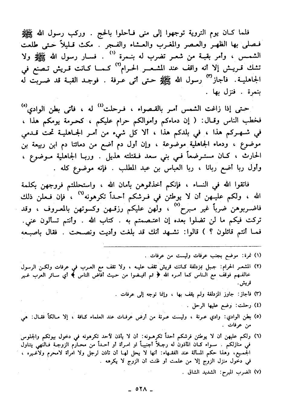 فاتقوا الله في النساء، فإنكم أخذتموهن بأمان الله، واستحللتم فروجهن بكلمة الله، ولكم عليهن أن لا يوطئن في فرشكم أحدًا تكرهونه (¬6)، فإن فعلن ذلك فاضربوهن ضربًا غير مبرح (¬7)، ولهن عليكم رزقهن وكسوتهن بالمعروف، وقد تركت فيكم ما لن تضلوا بعده إن اعتصمتم به. كتاب الله. وأنتم تسألون عني. فما أنتم قائلون؟ " قالوا: نشهد أنك قد بلغت وأديت ونصحت. فقال بأصبعه