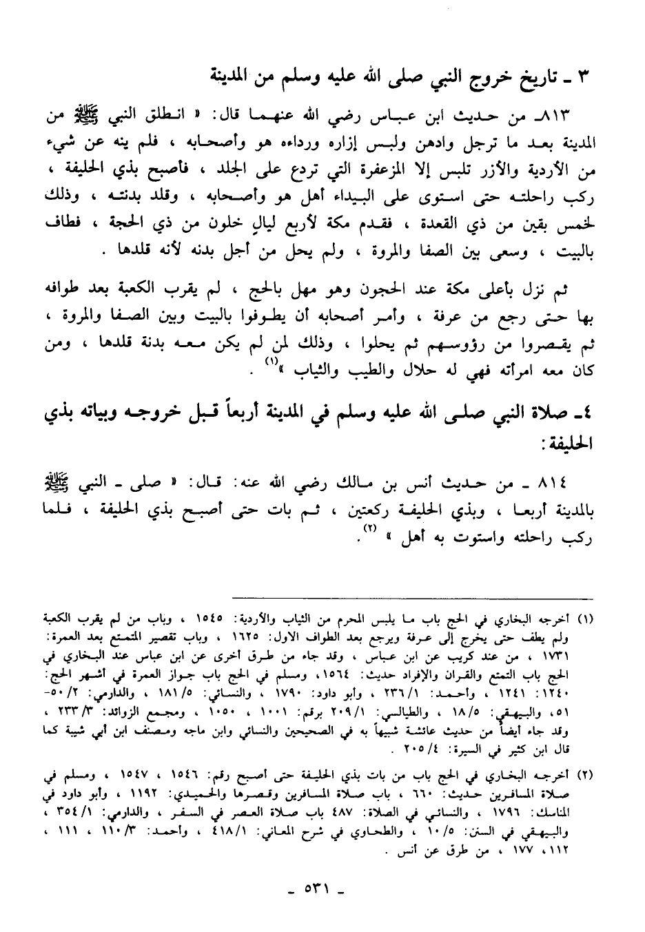 814 - من حديث أنس بن مالك رضي الله عنه: قال: "صلى- النبي - صلى الله عليه وسلم - بالمدينة أربعًا، وبذي الحليفة ركعتن، ثم بات حتى أصبح بذي الحليفة، فلما ركب راحلته واستوت به أهل" (¬2).