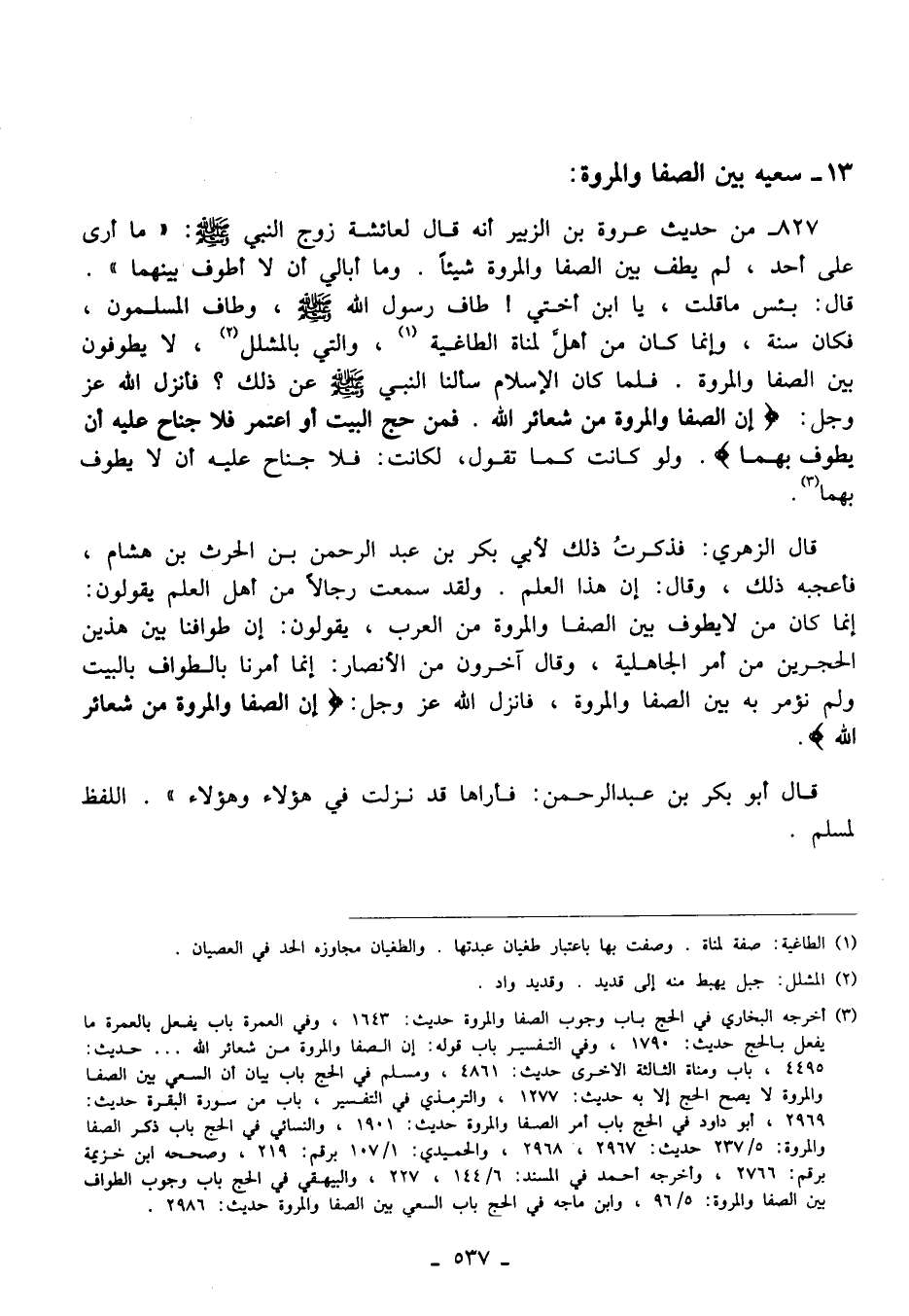 (¬3) أخرجه البخاري في الحج باب وجوب الصفا والمروة حديث: 1643، وفي العمرة باب يفعل بالعمرة ما يفعل بالحج حديث: 1790، وفي التفسير باب قوله: إن الصفا والمروة من شعائر الله ... حديث: 4495، باب ومناة الثالثة الأخرى حديث: 4861، ومسلم في الحج باب بيان أن السعي بين الصفا والمروة لا يصح الحج إلا به حديث: 1277، والترمذي في التفسير، باب من سورة البقرة حديث: 2969، أبو داود في الحج باب أمر الصفا والمروة حديث: 1901، والنسائي في الحج باب ذكر الصفا والمروة: 5/ 237 حديث: 2967،2968، والحميدي: 1/ 107 برقم: 219، وصححه ابن خزيمة برقم: 2766، وأخرجه أحمد في المسند: 6/ 144، 227، والبيهقي في الحج باب وجوب الطواف بين الصفا والمروة: 5/ 96، وابن ماجة في الحج باب السعي بين الصفا والمروة حديث: 2986.