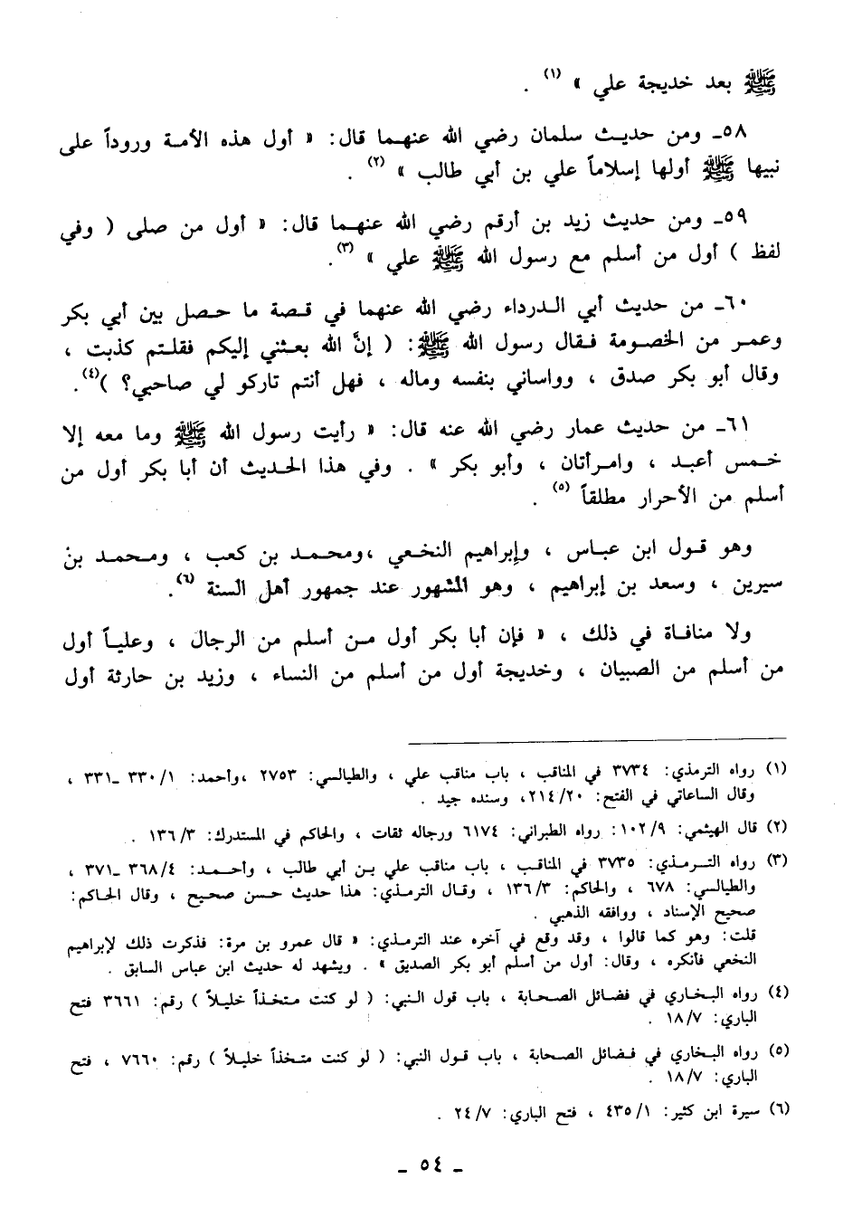 58 - ومن حديث سلمان - رضي الله عنهما - قال: "أول هذه الأمة ورودًا على نبيها - صلى الله عليه وسلم - أولها إسلامًا علي بن أبي طالب" (¬2).