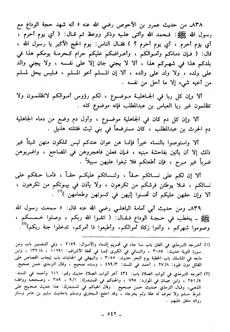 838 - من حديث عمرو بن الأحوص رضي الله عنه "أنه شهد حجة الوداع مع رسول الله - صلى الله عليه وسلم -: فحمد الله وأثنى عليه وذكر ووعظ ثم قال: "أي يوم أحرم، أي يوم أحرم، أي يوم أحرم؟ " فقال الناس: يوم الحج الأكبر يا رسول الله، قال: "فإن دماءكم وأموالكم، وأعراضكم عليكم حرام كحرمة يومكم هذا في بلدكم هذا في شهركم هذا، ألا لا يجني جان إلا على نفسه، ولا يجني والد على ولده، ولا ولد على والده، ألا إن المسلم أخو المسلم، فليس يحل لمسلم من أخيه شيء إلا ما أحل من نفسه.