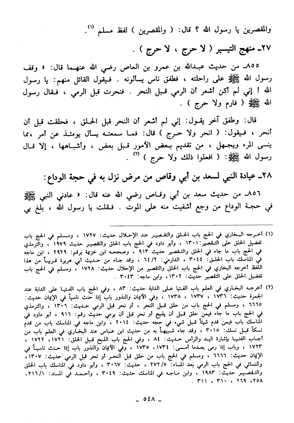 855 - من حديث عبد الله بن عمرو بن العاص رضي الله عنهما قال: "وقف رسول الله - صلى الله عليه وسلم - على راحلته، فطفق ناس يسألونه. فيقول القائل منهم: يا رسول الله! إني لم أكن أشعر أن الرمي قبل النحر. فنحرت قبل الرمي، فقال رسول الله - صلى الله عليه وسلم - "فارم ولا حرج".