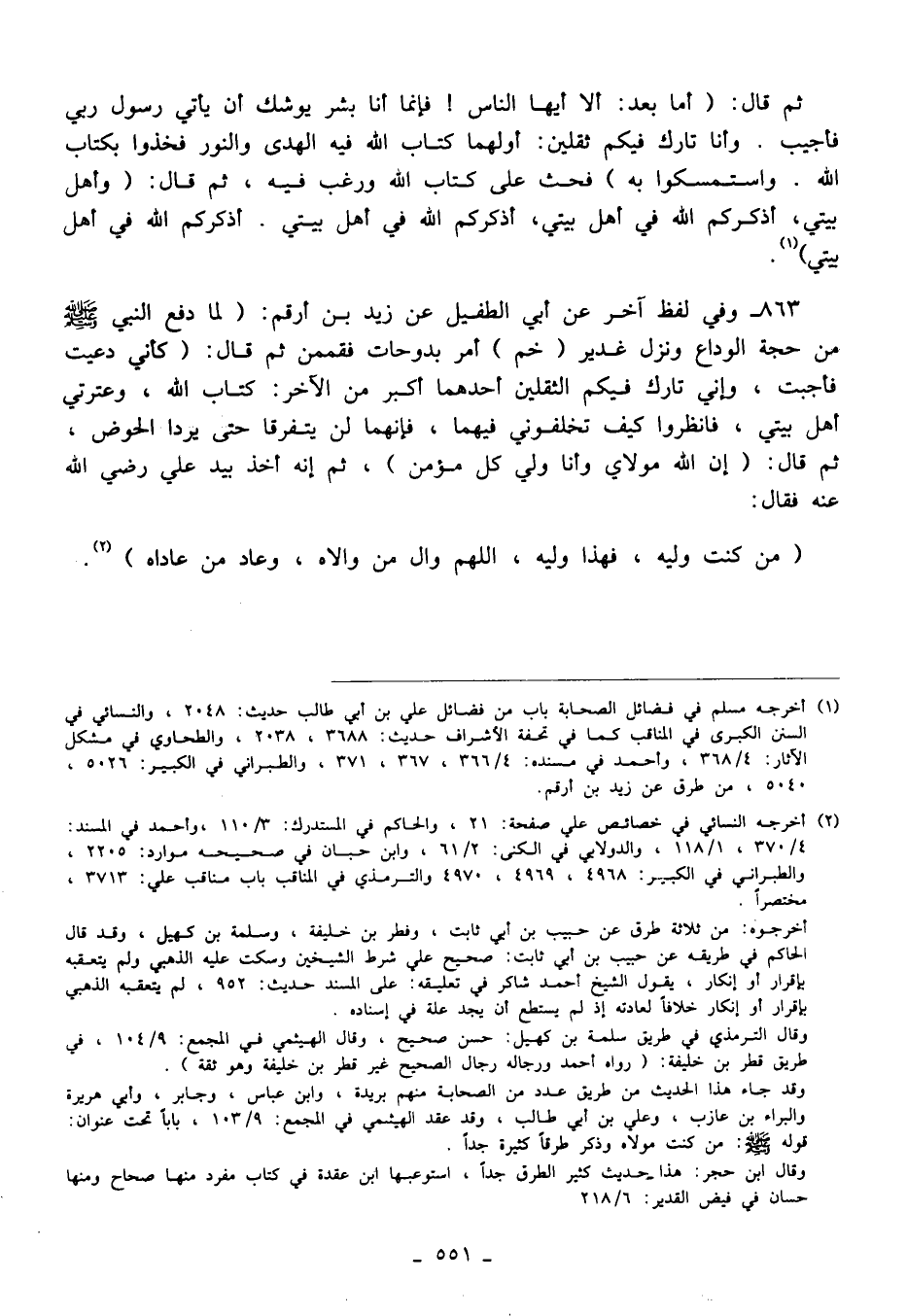 863 - وفي لفظ آخر عن أبي الطفيل عن زيد بن أرقم: (لما دفع النبي - صلى الله عليه وسلم - عن حجة الوداع ونزل غدير (خم) أمر بدوحات فقممن ثم قال: (كأني دعيت فأجبت، وإني تارك فيكم الثقلين أحدهما أكبر من الآخر: كتاب الله، وعترتي أهل بيتي، فانظروا كيف تخلفوني فيهما، فإنهما لن يتفرقا حتى يردا الحوض، ثم قال: (إن الله مولاي وأنا ولي كل مؤمن)، ثم إنه أخذ بيد علي رضي الله عنه فقال: