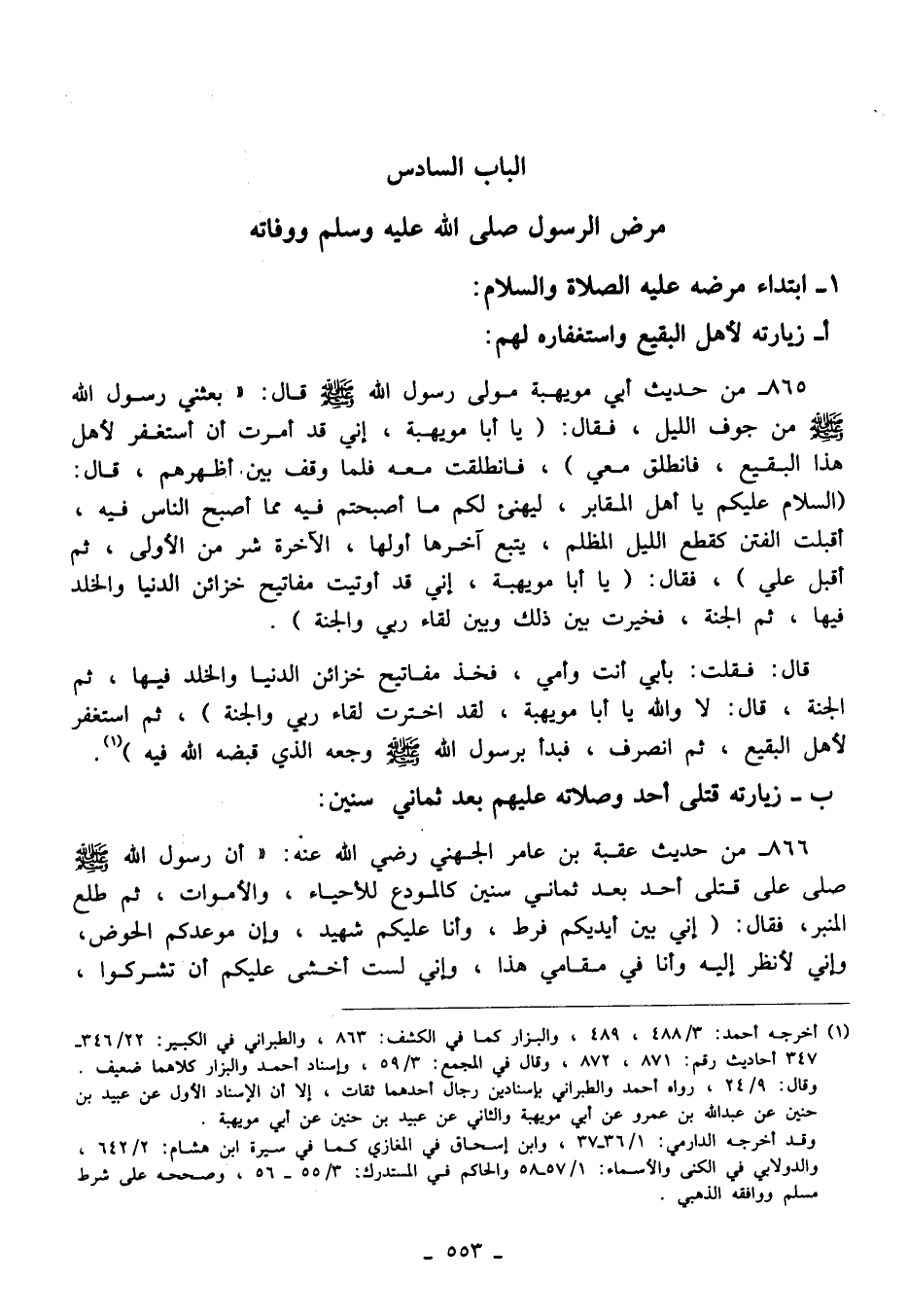 865 - من حديث أبي مويهبة مولى رسول الله - صلى الله عليه وسلم - قال: "بعثني رسول الله - صلى الله عليه وسلم - من جوف الليل، فقال: "يا أبا مويهبة، إني قد أمرت أن أستغفر لأهل هذا البقيع، فانطلق معي"، فانطلقت معه فلما وقف بين أظهرهم، قال: (السلام عليكم يا أهل المقابر، ليهنئ لكم ما أصبحتم فيه مما أصبح الناس فيه، أقبلت الفتن كقطع الليل المظلم، يتبع آخرها أولها، الآخرة شر من الأولى، ثم أقبل علي)، فقال: (يا أبا مويهبة، إني قد أوتيت مفاتيح خزائن الدنيا والخلد فيها، ثم الجنة، فخيرت بين ذلك وبين لقاء ربي والجنة).