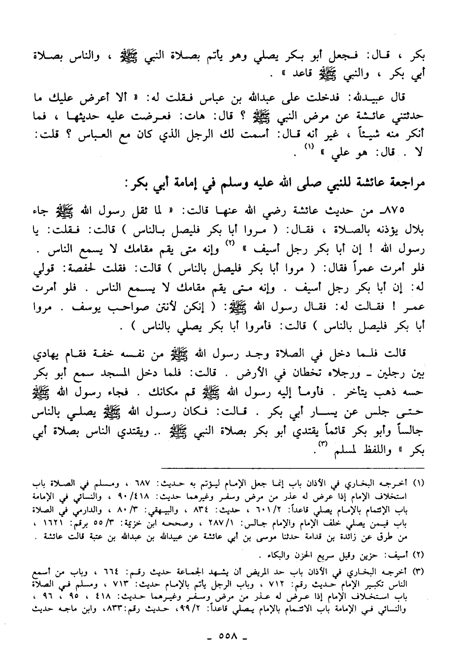 875 - من حديث عائشة رضي الله عنها قالت: "لما ثقل رسول الله - صلى الله عليه وسلم - جاء بلال يؤذنه بالصلاة، فقال: "مروا أبا بكر فليصل بالناس" قالت: فقلت: يا رسول الله! إن أبا بكر رجل أسيف" (¬2) وإنه متى يقم مقامك لا يسمع الناس. فلو أمرت عمرًا فقال: "مروا أبا بكر فليصل بالناس" قالت: فقلت لحفصة: قولي له: إن أبا بكر رجل أسيف. وإنه متى يقم مقامك لا يسمع الناس. فلو أمرت عمر! فقالت له: فقال رسول الله - صلى الله عليه وسلم -: "إنكن لأنتن صواحب يوسف. مروا أبا بكر فليصل بالناس" قالت: فأمروا أبا بكر يصلي بالناس".
