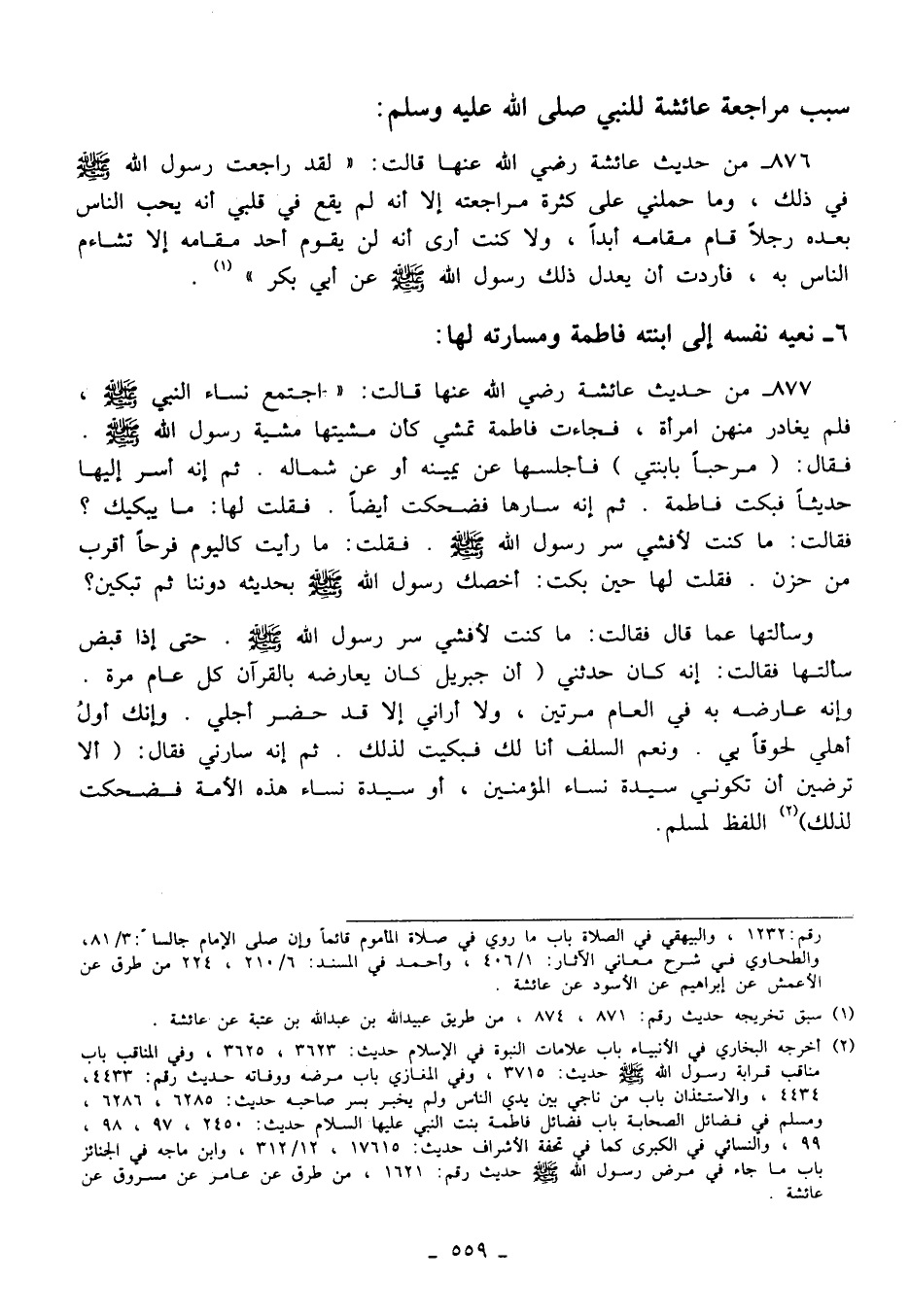 (¬2) أخرجه البخاري في الأنبياء باب علامات النبوة في الإِسلام حديث: 3623، 3625، وفي المناقب باب مناقب قرابة رسول الله - صلى الله عليه وسلم - حديث: 3715، وفي المغازي باب مرضه ووفاته حديث رقم: 4433، 4434، والاستئذان باب من ناجي بين يدي الناس ولم يخبر بسر صاحبه حديث: 6285، 6286، ومسلم في فضائل الصحابة باب فضائل فاطمة بنت النبي عليها السلام حديث: 2450، 97، 98، 99، والنسائي في الكبرى كما في تحفة الأشراف حديث: 17615، 12/ 312، وابن ماجه في الجنائز باب ما جاء في مرض رسول الله - صلى الله عليه وسلم - حديث رقم: 1621، من طرق عن عامر عن مسروق عن عائشة.
