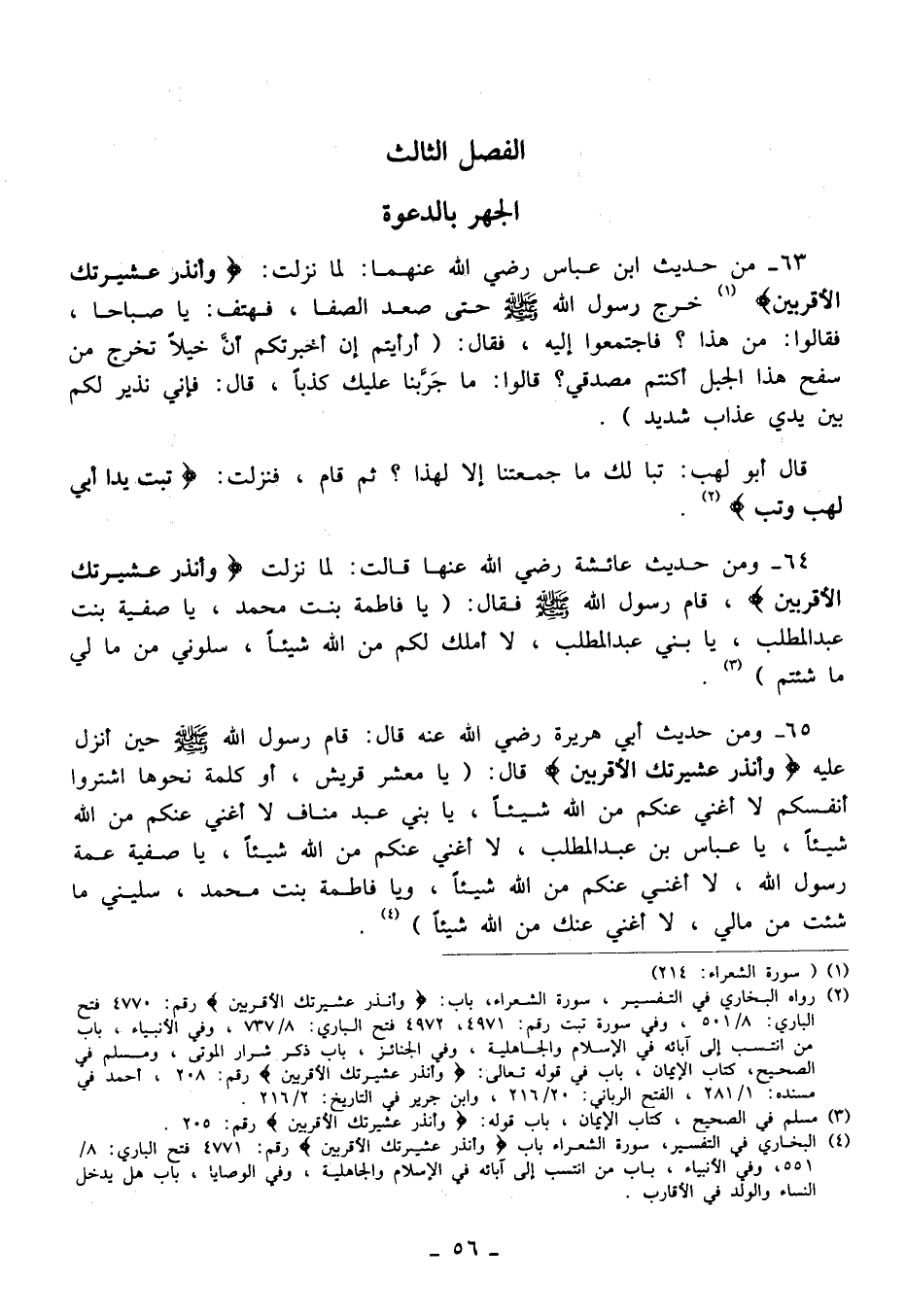 (¬4) البخاري في التفسير، سورة الشعراء باب {وَأَنْذِرْ عَشِيرَتَكَ الْأَقْرَبِينَ} رقم:4771 فتح الباري: 8/ 551، وفي الأنبياء، باب من انتسب إلى آبائه في الإسلام والجاهلية، وفي الوصايا، باب هل يدخل النساء والولد في الأقارب.