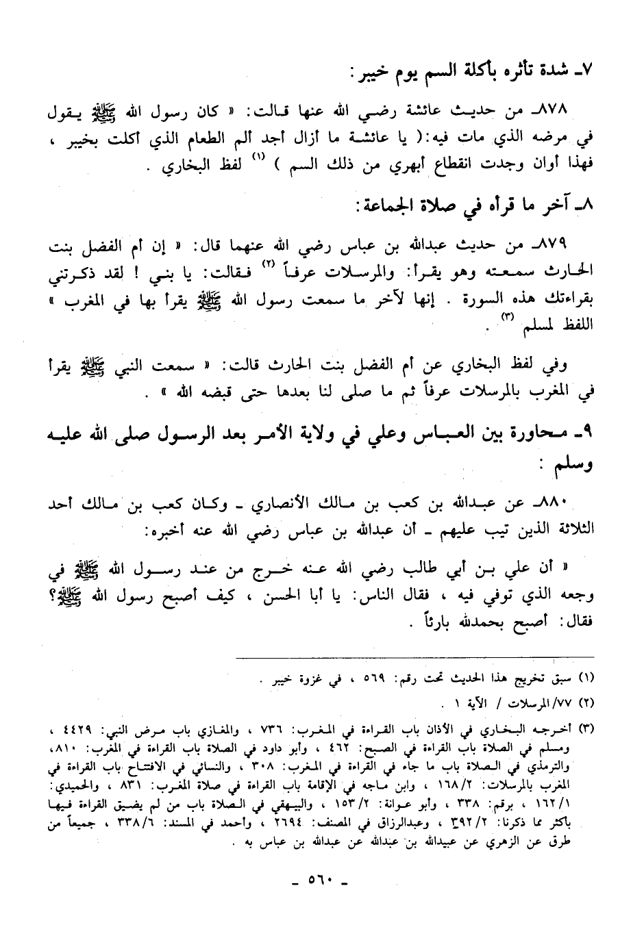 879 - من حديث عبد الله بن عباس رضي الله عنهما قال: "إن أم الفضل بنت الحارث سمعته وهو يقرأ: والمرسلات عرفًا (¬2) فقالت: يا بني! لقد ذكرتني بقراءتك هذه السورة. إنها لآخر ما سمعت رسول الله - صلى الله عليه وسلم - يقرأ بها في المغرب" اللفظ لمسلم (¬3).