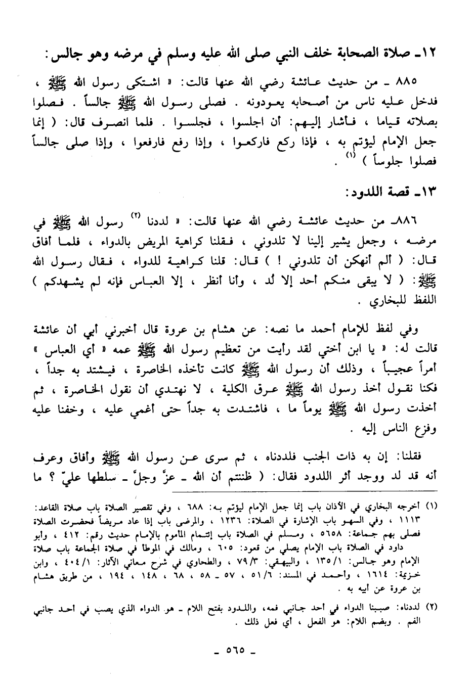 886 - من حديث عائشة رضي الله عنها قالت: "لددنا (¬2) رسول الله - صلى الله عليه وسلم - في مرضه، وجعل يشير إلينا لا تلدوني، فقلنا كراهية المريض بالدواء، فلما أفاق قال: "ألم أنهكن أن تلدوني! " قال: قلنا كراهية للدواء، فقال رسول الله - صلى الله عليه وسلم -: "لا يبقى منكم أحد إلا لُد، وأنا أنظر، إلا العباس فإنه لم يشهدكم" اللفظ للبخاري.