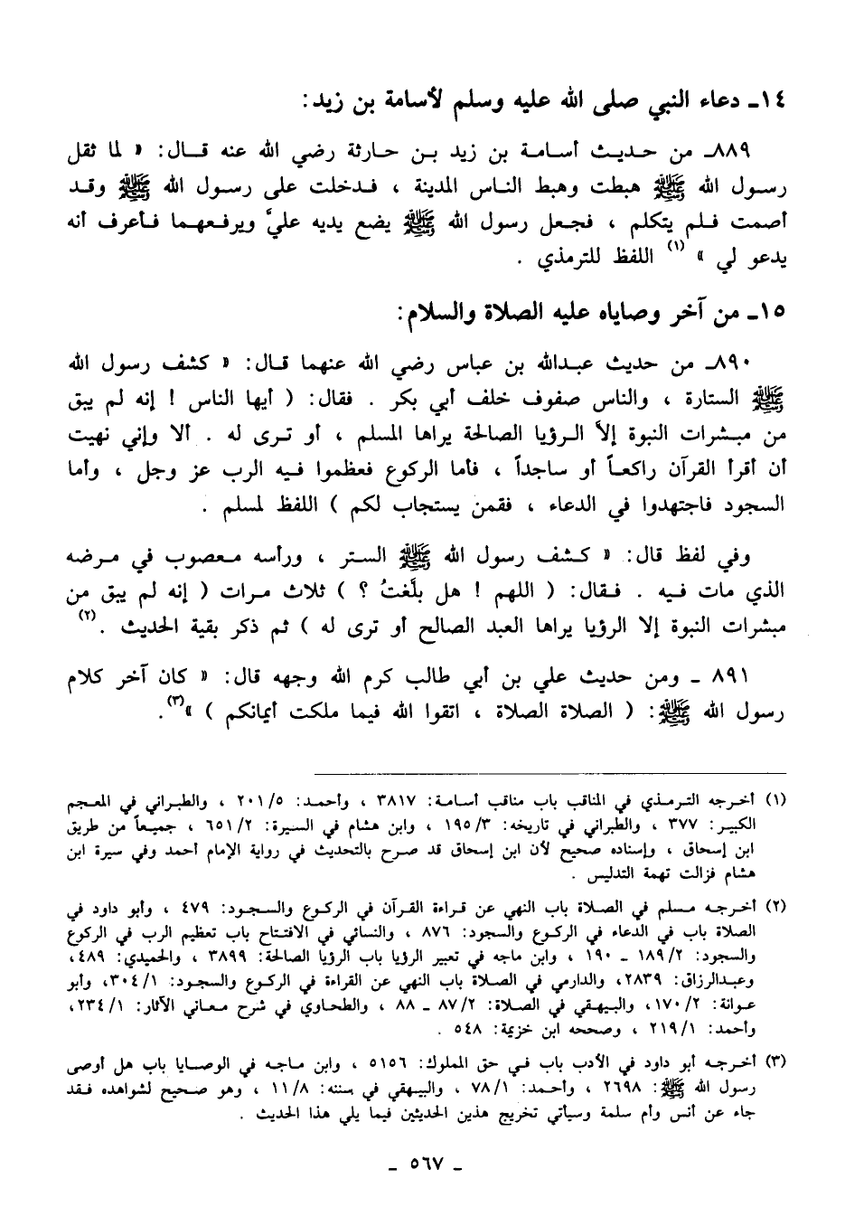 889 - من حديث أسامة بن زيد بن حارثة رضي الله عنه قال: "لما ثقل رسول الله - صلى الله عليه وسلم - هبطت وهبط الناس المدينة، فدخلت على رسول الله - صلى الله عليه وسلم - وقد أصمت فلم يتكلم، فجعل رسول الله - صلى الله عليه وسلم - يضع يديه عليَّ ويرفعهما فأعرف أنه يدعو لي" (¬1) اللفظ للترمذي.