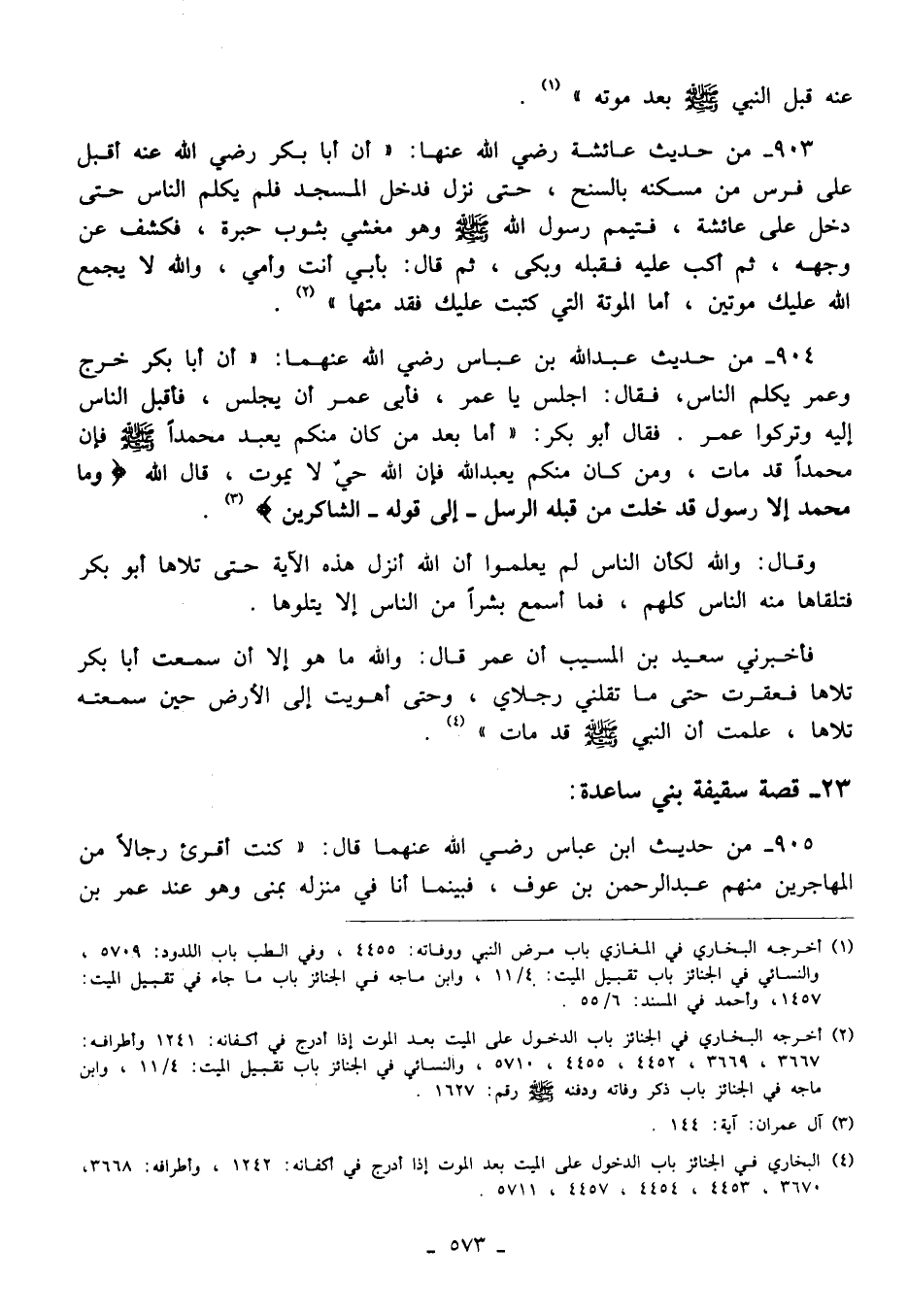 903 - من حديث عائشة رضي الله عنها: "أن أبا بكر رضي الله عنه أقبل على فرس من مسكنه بالسنح، حتى نزل فدخل المسجد فلم يكلم الناس حتى دخل على عائشة، فتيمم رسول الله - صلى الله عليه وسلم - وهو مغشي بثوب حبرة، فكشف عن وجهه، ثم أكب عليه فقبله وبكى، ثم قال: بأبي أنت وأمي، والله لا يجمع الله عليك موتين، أما الموتة التي كتبت عليك فقد متها" (¬2).